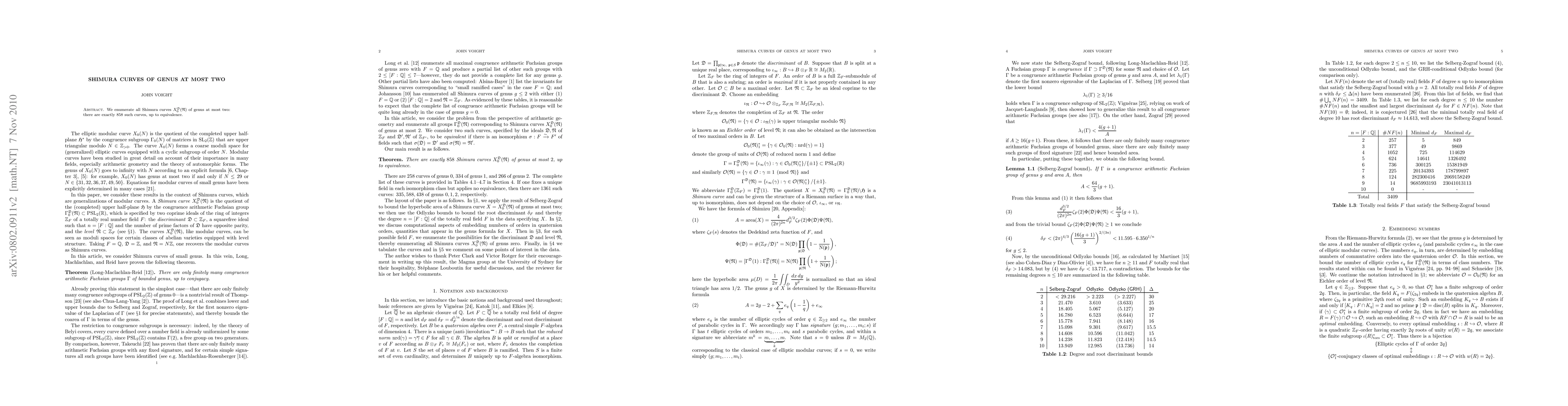 The paper presents an algorithm for enumerating Shimura curves of genus at most two, along with methods for computing embedding numbers and areas, contributing to the computational aspects of Shimura curve theory.