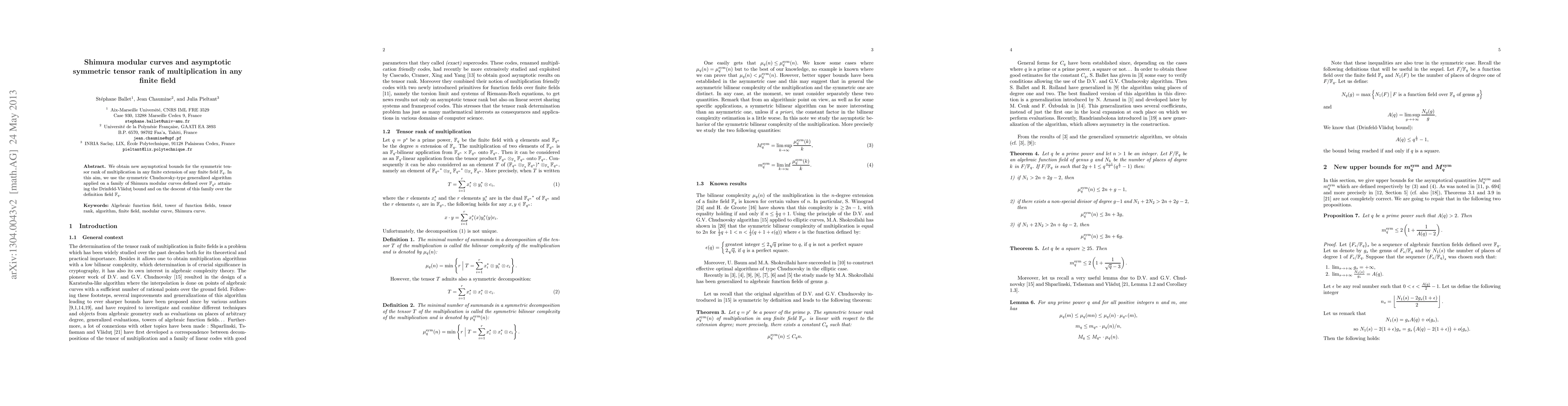Summary: This paper establishes new asymptotic bounds for the symmetric tensor rank of multiplication in any finite field extension. It leverages a symmetric Chudnovsky-type generalized algorithm applied to Shimura modular curves over $\F_{q^2}$, achieving the Drinfeld-Vladut bound through descent techniques.