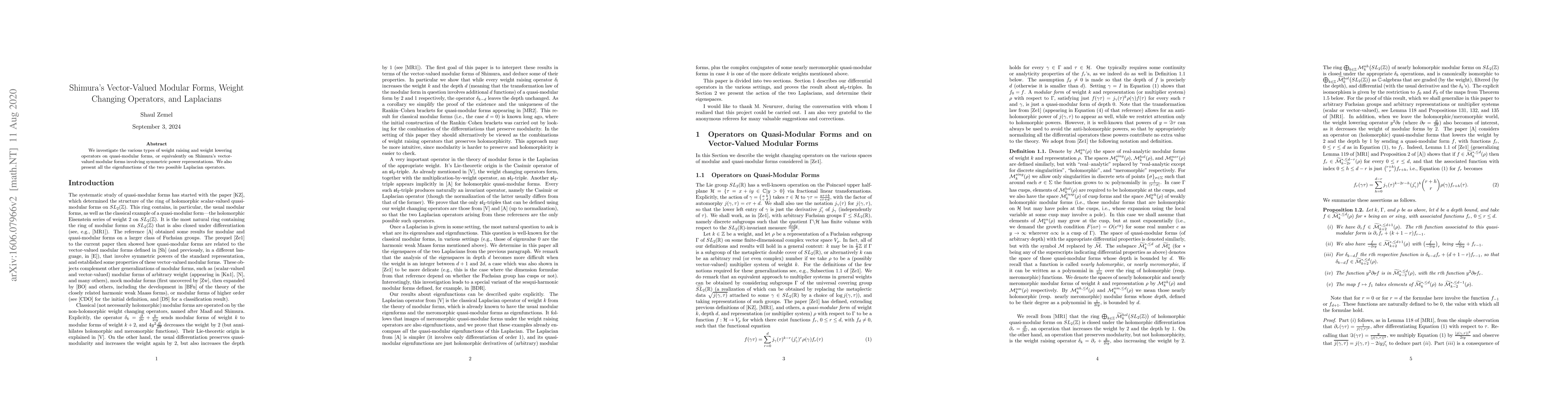 Summary: This paper explores weight-changing operators in Shimura's vector-valued modular forms, focusing on quasi-modular forms and symmetric power representations, and identifies eigenfunctions of associated Laplacian operators.