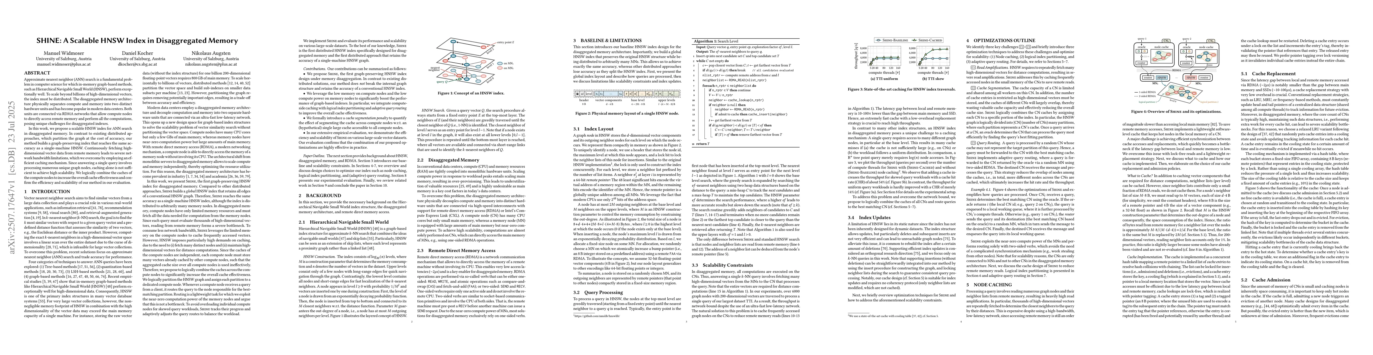 SHINE introduces a scalable HNSW index for disaggregated memory, combining an efficient caching mechanism with logical index partitioning to improve scalability and maintain accuracy.