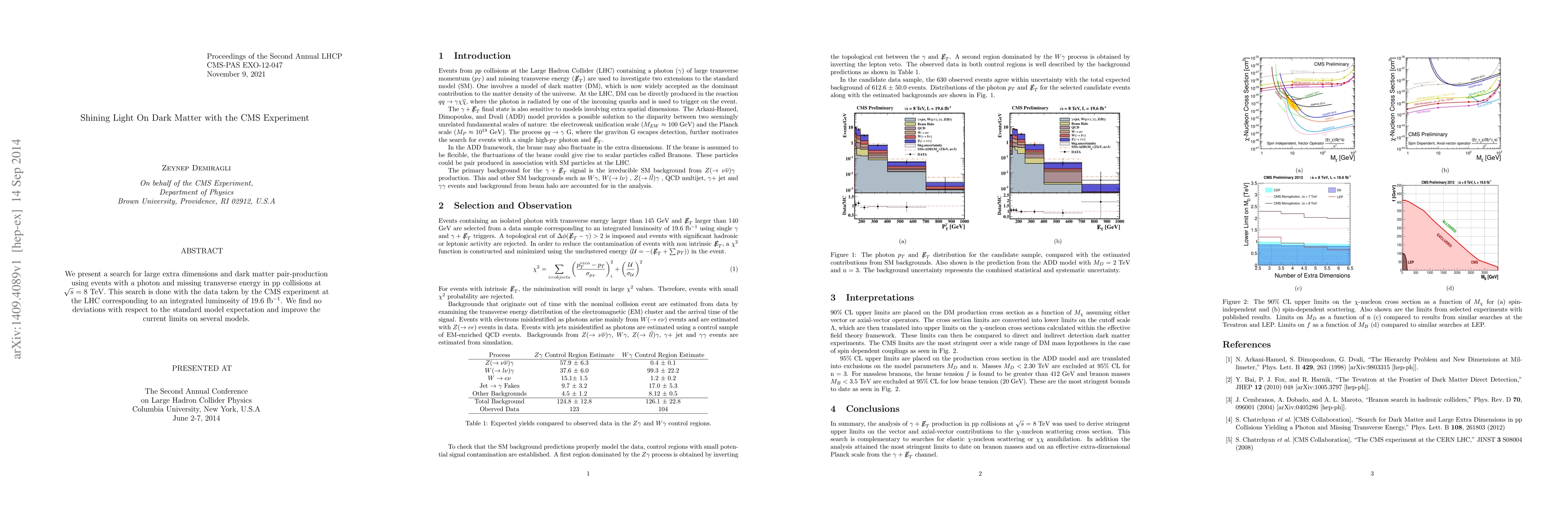 This paper reports a CMS experiment search for large extra dimensions and dark matter pair-production using photon and missing transverse energy events in 8 TeV proton-proton collisions. No deviations from standard model predictions were found, thereby improving existing limits on several theoretical models.