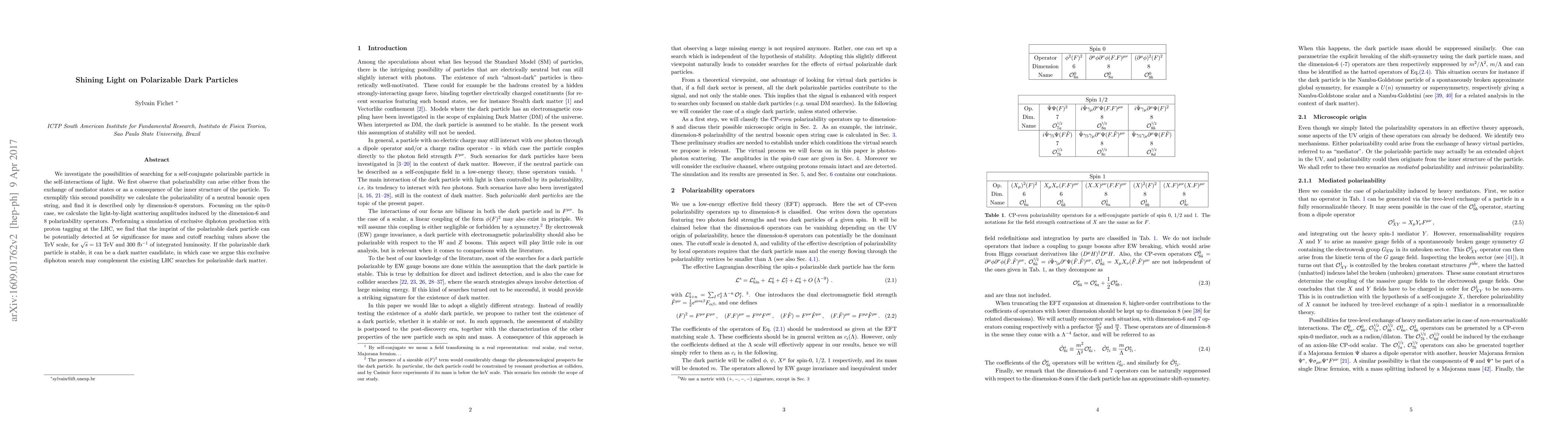 We investigate the possibilities of searching for a self-conjugate polarizable particle in the self-interactions of light. We first observe that polarizability can arise either from the exchange of mediator states or as a consequence of the inner structure of the particle. To exemplify this second possibility we calculate the polarizability of a neutral bosonic open string, and find it is described only by dimension-8 operators. Focussing on the spin-0 case, we calculate the light-by-light scattering amplitudes induced by the dimension-6 and 8 polarizability operators. Performing a simulation of exclusive diphoton production with proton tagging at the LHC, we find that the imprint of the polarizable dark particle can be potentially detected at 5$\sigma$ significance for mass and cutoff reaching values above the TeV scale, for $\sqrt{s}=$13~TeV and 300 fb$^{-1}$ of integrated luminosity. If the polarizable dark particle is stable, it can be a dark matter candidate, in which case we argue this exclusive diphoton search may complement the existing LHC searches for polarizable dark matter.