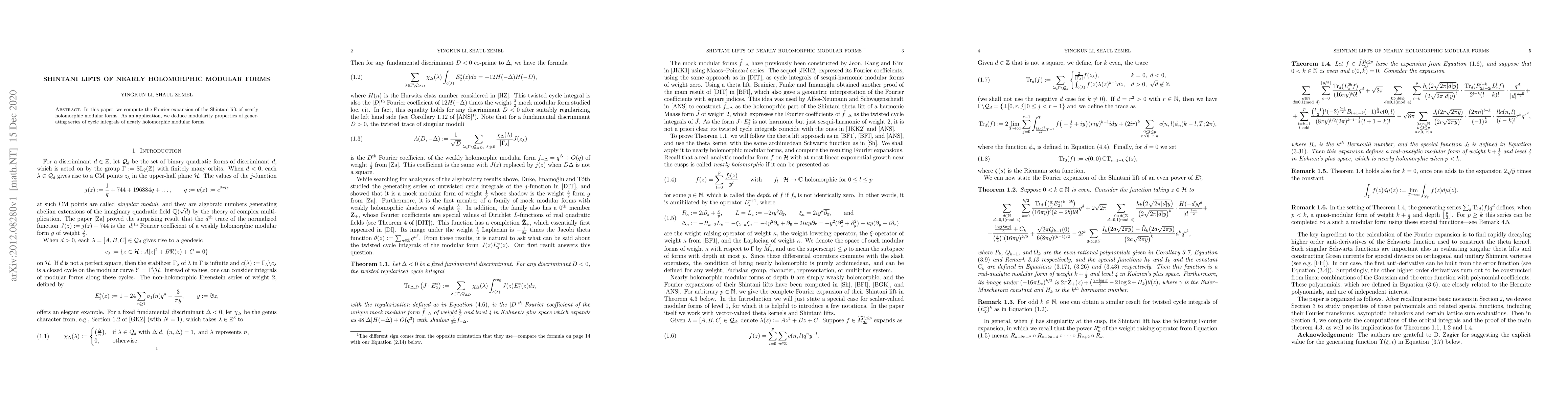 Summary: This paper computes the Fourier expansion of Shintani lifts of nearly holomorphic modular forms and uses the results to derive modularity properties for generating series of cycle integrals of these forms.