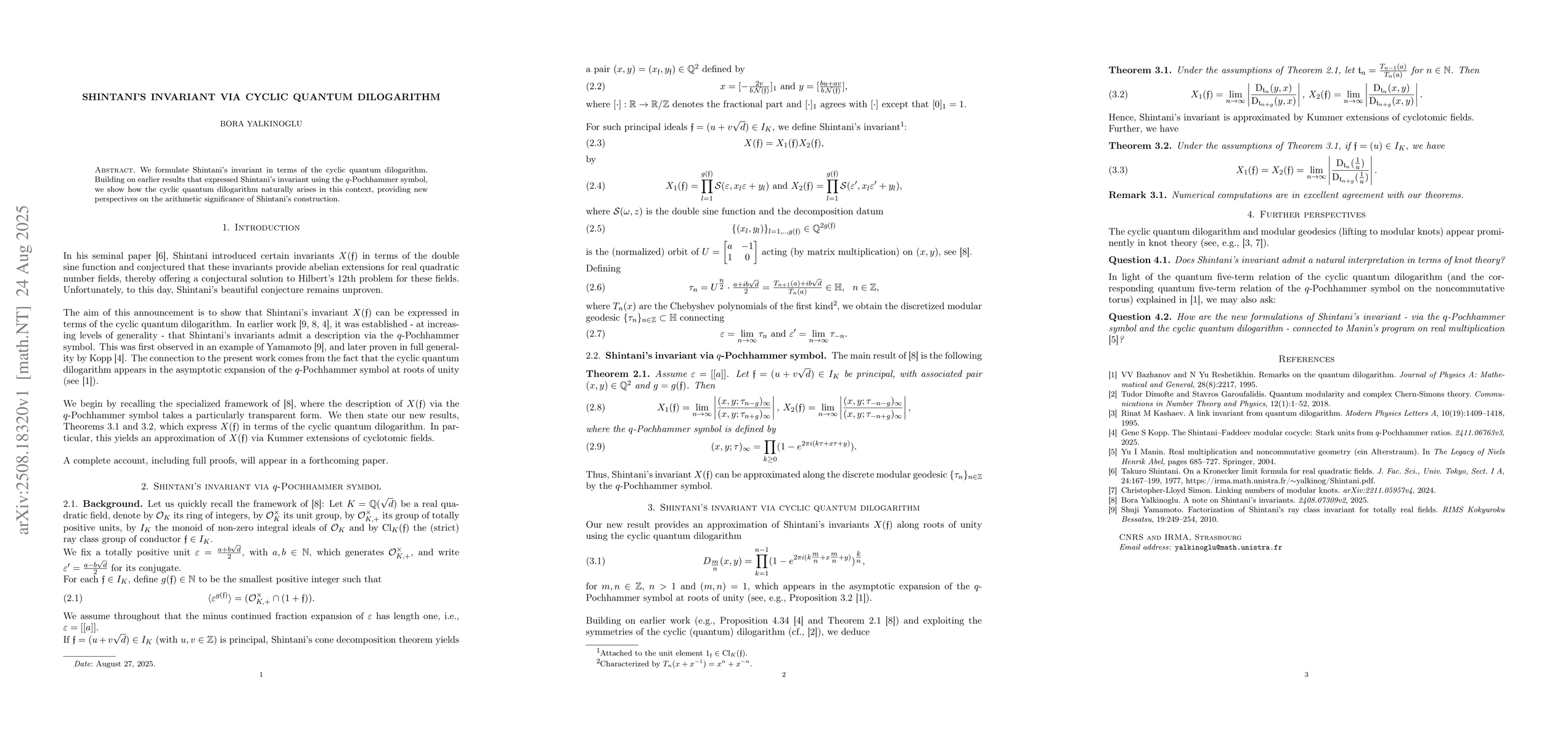 We formulate Shintani's invariant in terms of the cyclic quantum dilogarithm. Building on earlier results that expressed Shintani's invariant using the $q$-Pochhammer symbol, we show how the cyclic quantum dilogarithm naturally arises in this context, providing new perspectives on the arithmetic significance of Shintani's construction. The present note is an announcement; a full account with complete proofs will appear in a forthcoming paper.