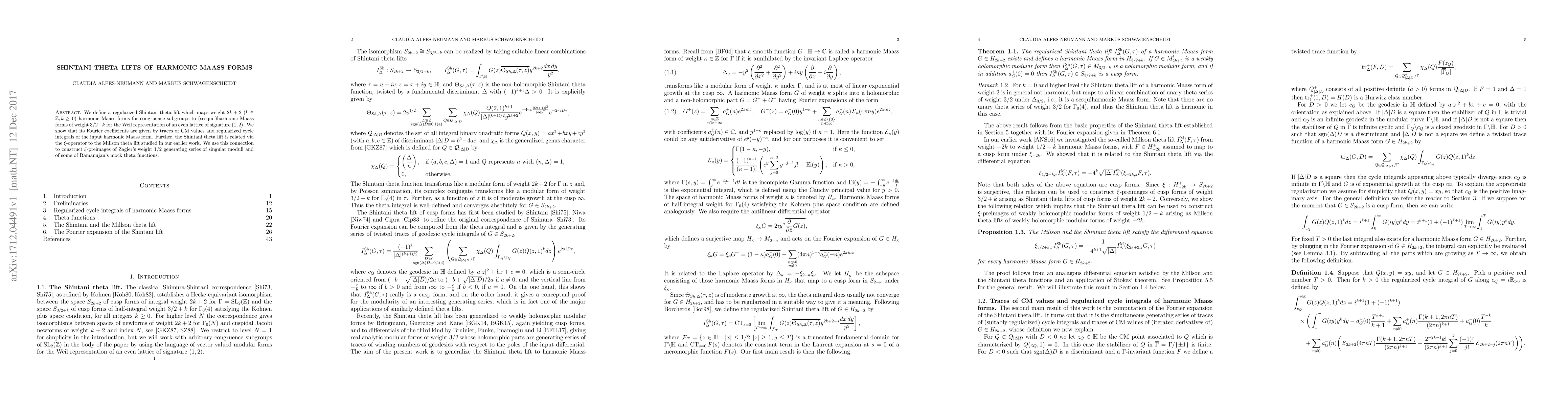 We define a regularized Shintani theta lift which maps weight $2k+2$ ($k \in \Z, k \geq 0$) harmonic Maass forms for congruence subgroups to (sesqui-)harmonic Maass forms of weight $3/2+k$ for the Weil representation of an even lattice of signature $(1,2)$. We show that its Fourier coefficients are given by traces of CM values and regularized cycle integrals of the input harmonic Maass form. Further, the Shintani theta lift is related via the $\xi$-operator to the Millson theta lift studied in our earlier work. We use this connection to construct $\xi$-preimages of Zagier's weight $1/2$ generating series of singular moduli and of some of Ramanujan's mock theta functions.