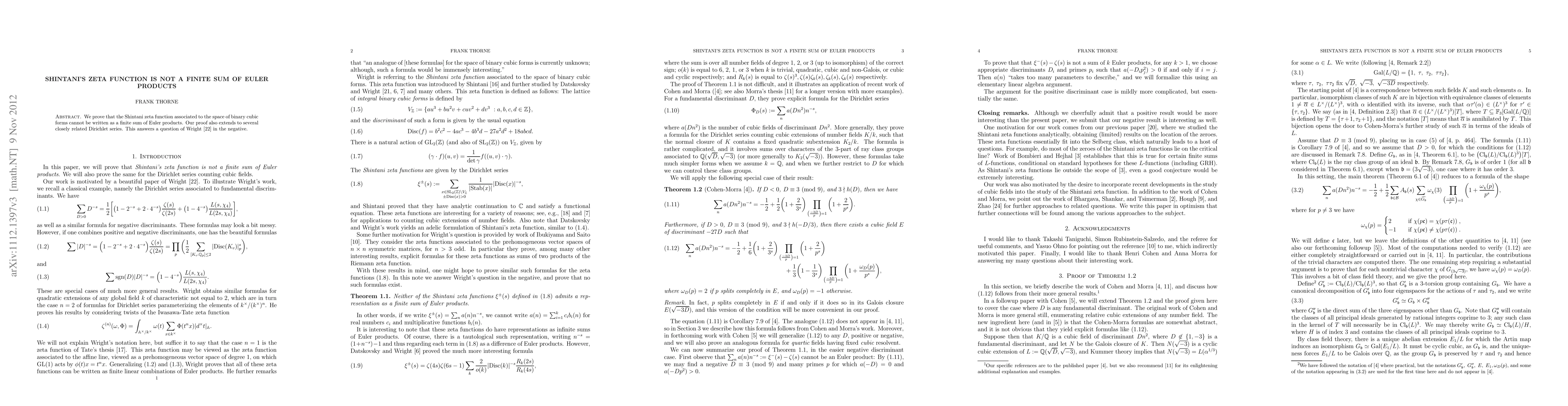 We prove that the Shintani zeta function associated to the space of binary cubic forms cannot be written as a finite sum of Euler products. Our proof also extends to several closely related Dirichlet series. This answers a question of Wright in the negative.
