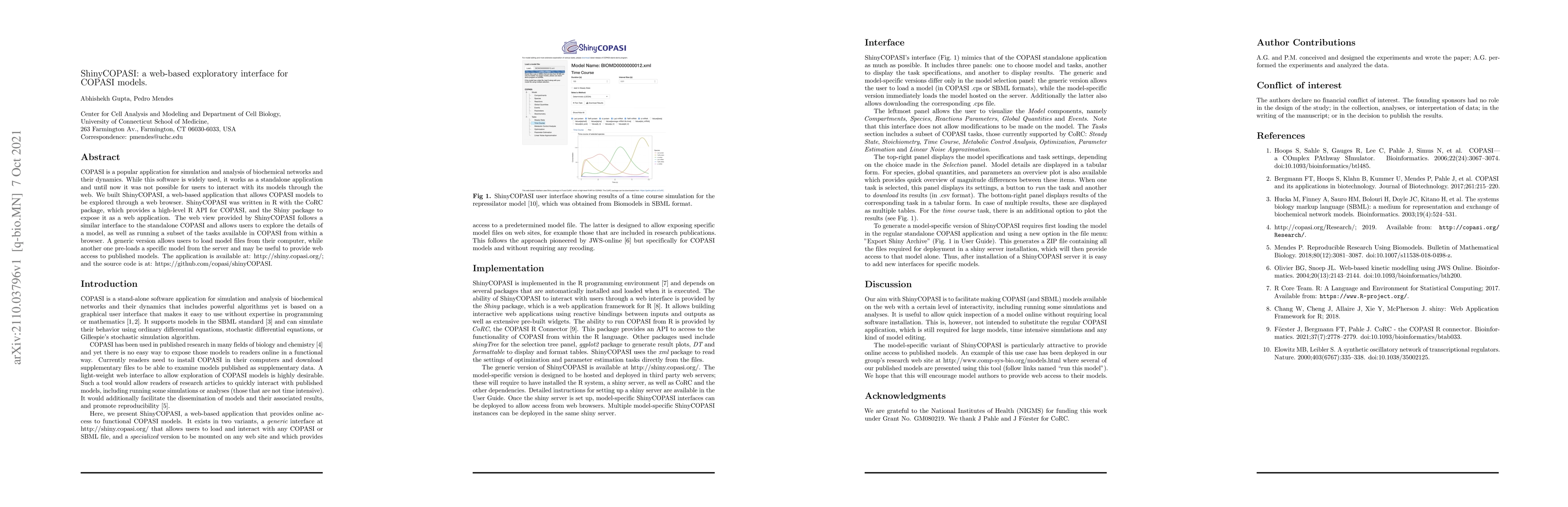COPASI is a popular application for simulation and analysis of biochemical networks and their dynamics. While this software is widely used, it works as a standalone application and until now it was not possible for users to interact with its models through the web. We built ShinyCOPASI, a web-based application that allows COPASI models to be explored through a web browser. ShinyCOPASI was written in R with the CoRC package, which provides a high-level R API for COPASI, and the Shiny package to expose it as a web application. The web view provided by ShinyCOPASI follows a similar interface to the standalone COPASI and allows users to explore the details of a model, as well as running a subset of the tasks available in COPASI from within a browser. A generic version allows users to load model files from their computer, while another one pre-loads a specific model from the server and may be useful to provide web access to published models. The application is available at: http://shiny.copasi.org/; and the source code is at: https://github.com/copasi/shinyCOPASI.