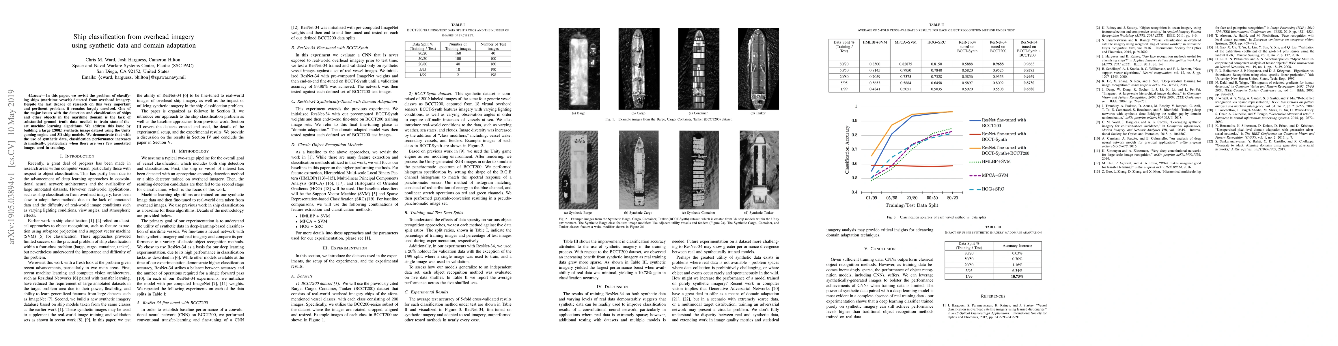 This paper tackles the challenge of classifying ships from overhead imagery by generating a large synthetic dataset using the Unity engine and 3D models. The study shows significant improvements in classification performance, especially when few annotated real images are available, leveraging domain adaptation techniques.