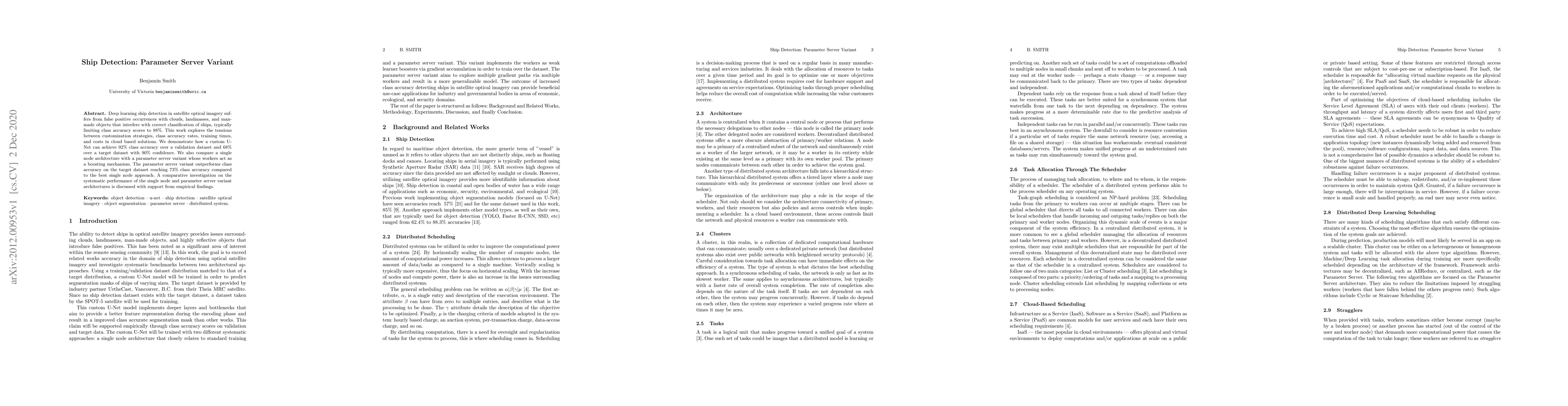 A custom U-Net architecture achieved 92% class accuracy in ship detection, outperforming a single node approach with 73% accuracy when using a parameter server variant.