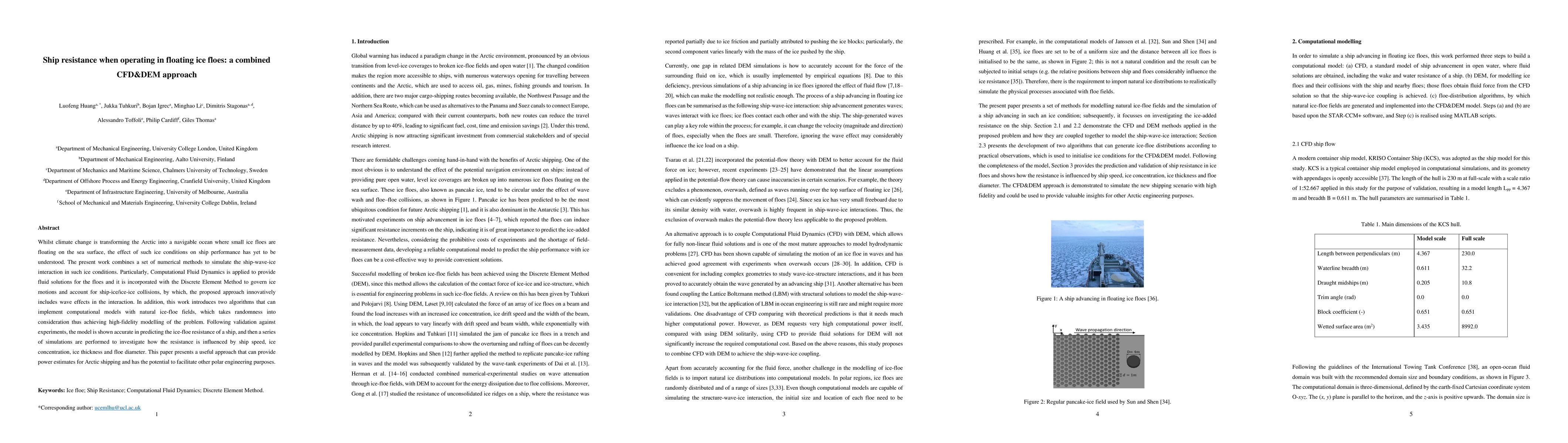 This paper combines Computational Fluid Dynamics and Discrete Element Method to simulate ship resistance in floating ice floes, validated against experiments. The approach considers wave effects, ship speed, ice concentration, thickness, and floe diameter, providing accurate power estimates for Arctic shipping.