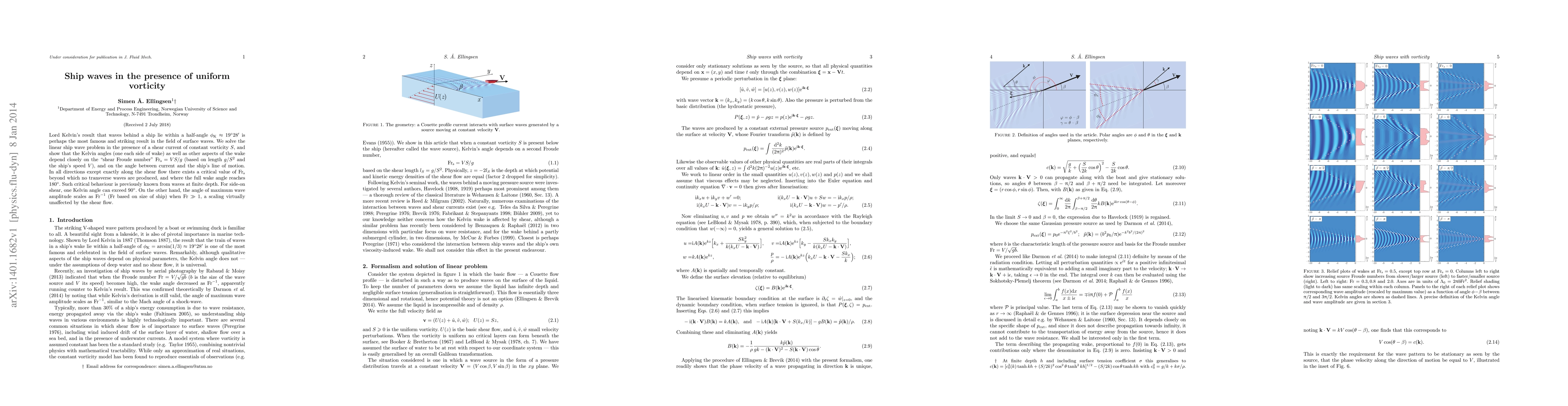 Research finds that ship waves in the presence of uniform vorticity depend on a key parameter called the shear Froude number, which determines whether transverse waves are produced and how much the full wake angle reaches.