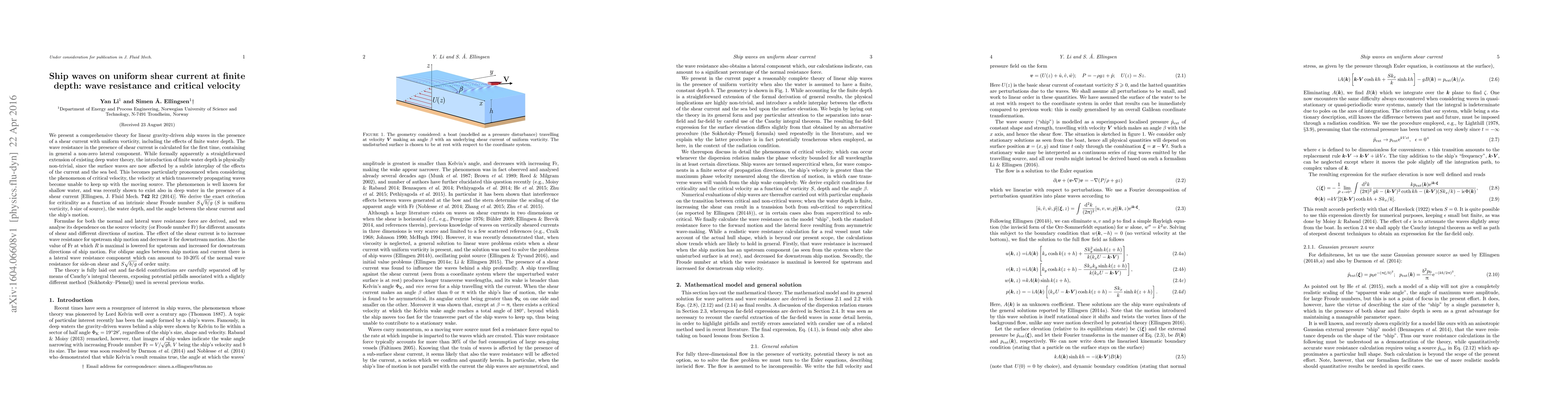We present a comprehensive theory for linear gravity-driven ship waves in the presence of a shear current with uniform vorticity, including the effects of finite water depth. The wave resistance in the presence of shear current is calculated for the first time, containing in general a non-zero lateral component. While formally apparently a straightforward extension of existing deep water theory, the introduction of finite water depth is physically non-trivial, since the surface waves are now affected by a subtle interplay of the effects of the current and the sea bed. This becomes particularly pronounced when considering the phenomenon of critical velocity, the velocity at which transversely propagating waves become unable to keep up with the moving source. The phenomenon is well known for shallow water, and was recently shown to exist also in deep water in the presence of a shear current [Ellingsen, J.~Fluid Mech.\ {\bf 742} R2 (2014)]. We derive the exact criterion for criticality as a function of an intrinsic shear Froude number $S\sqrt{b/g}$ ($S$ is uniform vorticity, $b$ size of source), the water depth, and the angle between the shear current and the ship's motion. Formulae for both the normal and lateral wave resistance force are derived, and we analyse its dependence on the source velocity (or Froude number $Fr$) for different amounts of shear and different directions of motion. The effect of the shear current is to increase wave resistance for upstream ship motion and decrease it for downstream motion. Also the value of $Fr$ at which $R$ is maximal is lowered for upstream and increased for downstream directions of ship motion. For oblique angles between ship motion and current there is a lateral wave resistance component which can amount to $10$-$20\%$ of the normal wave resistance for side-on shear and $S\sqrt{b/g}$ of order unity. (Continues...)