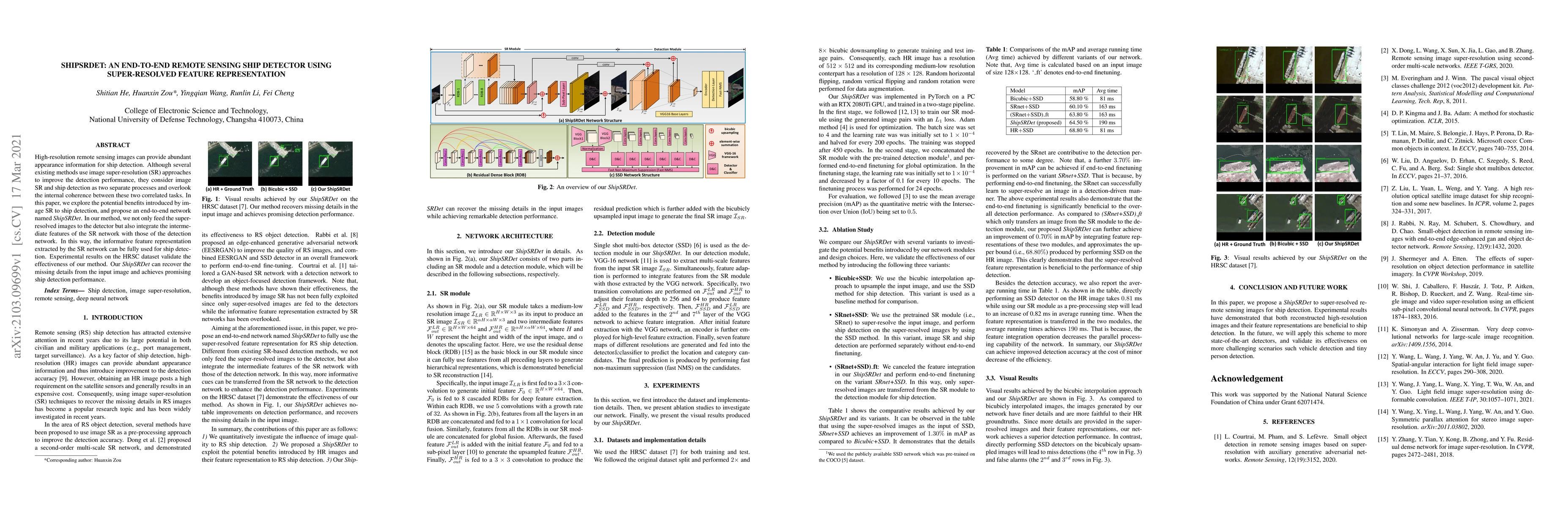 ShipSRDet integrates super-resolution and ship detection into an end-to-end network, leveraging super-resolved features to enhance detection performance and improve detail recovery. Experimental results show significant improvements in ship detection accuracy on the HRSC dataset.