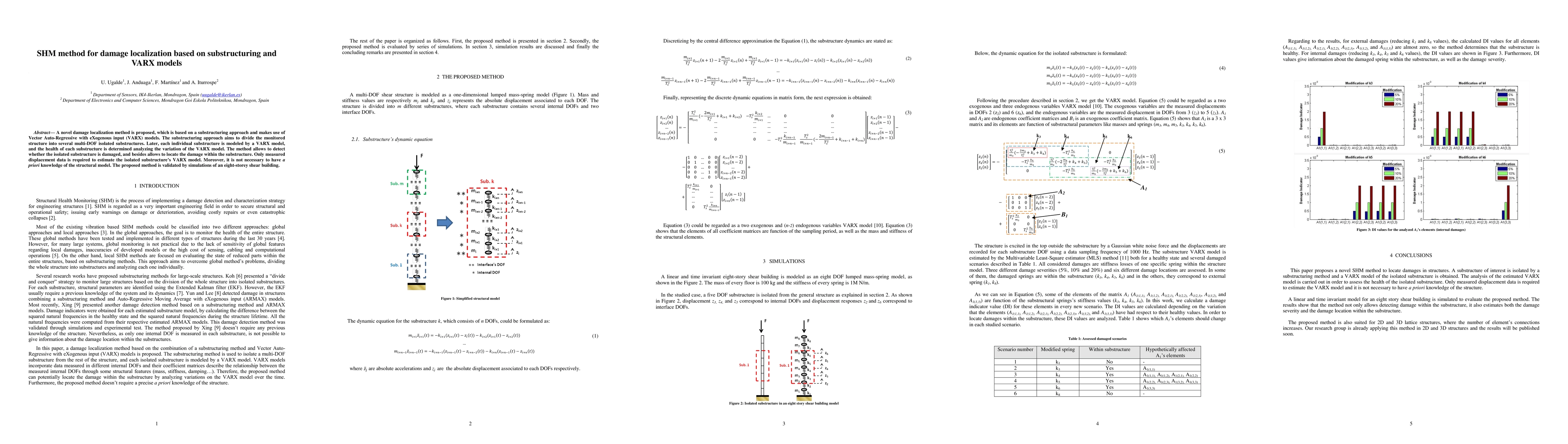 A novel damage localization method is proposed, which is based on a substructuring approach and makes use of Vector Auto-Regressive with eXogenous input (VARX) models. The substructuring approach aims to divide the monitored structure into several multi-DOF isolated substructures. Later, each individual substructure is modeled by a VARX model, and the health of each substructure is determined analyzing the variation of the VARX model. The method allows to detect whether the isolated substructure is damaged, and besides allows to locate the damage within the substructure. Only measured displacement data is required to estimate the isolated substructure's VARX model. Moreover, it is not necessary to have a priori knowledge of the structural model. The proposed method is validated by simulations of an eight-storey shear building.