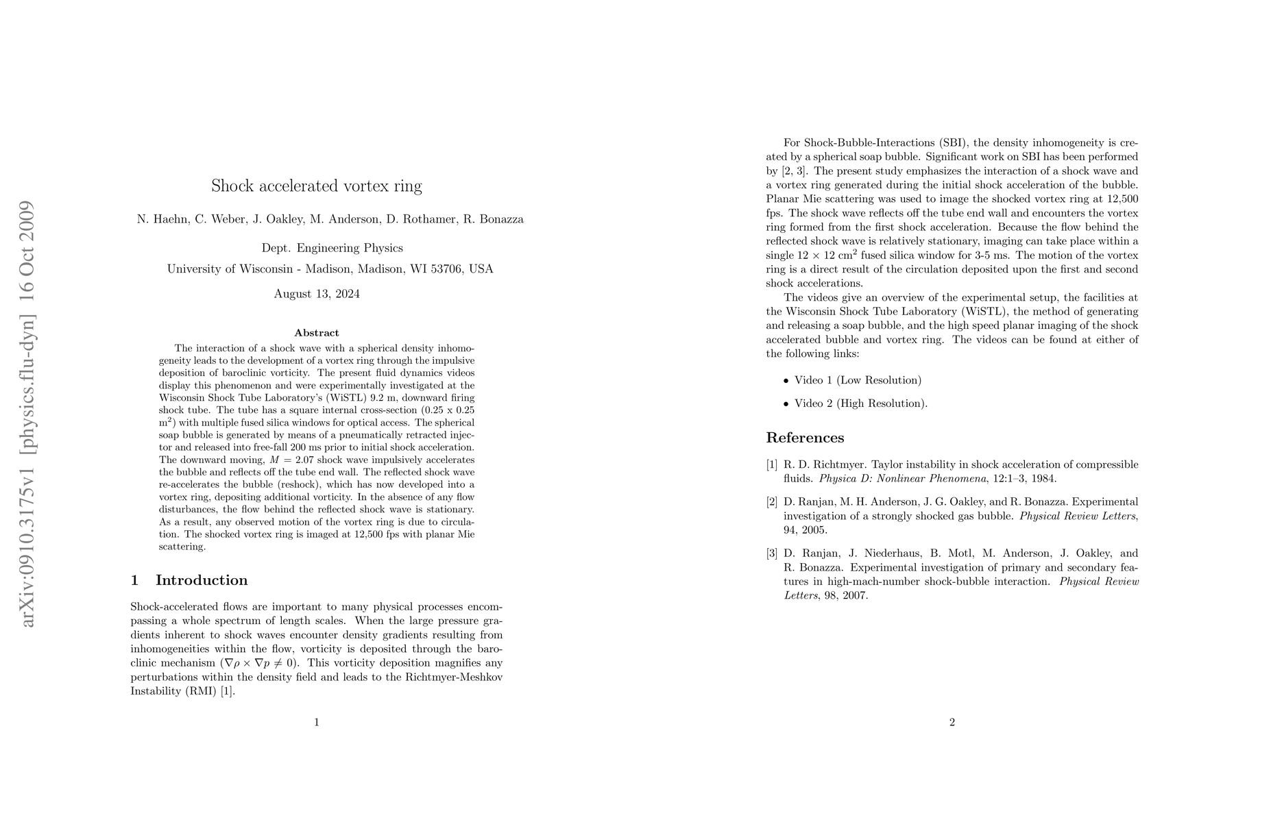 The interaction of a shock wave with a spherical density inhomogeneity leads to the development of a vortex ring through the impulsive deposition of baroclinic vorticity. The present fluid dynamics videos display this phenomenon and were experimentally investigated at the Wisconsin Shock Tube Laboratory's (WiSTL) 9.2 m, downward firing shock tube. The tube has a square internal cross-section (0.25 m x 0.25 m) with multiple fused silica windows for optical access. The spherical soap bubble is generated by means of a pneumatically retracted injector and released into free-fall 200 ms prior to initial shock acceleration. The downward moving, M = 2.07 shock wave impulsively accelerates the bubble and reflects off the tube end wall. The reflected shock wave re-accelerates the bubble (reshock), which has now developed into a vortex ring, depositing additional vorticity. In the absence of any flow disturbances, the flow behind the reflected shock wave is stationary. As a result, any observed motion of the vortex ring is due to circulation. The shocked vortex ring is imaged at 12,500 fps with planar Mie scattering.