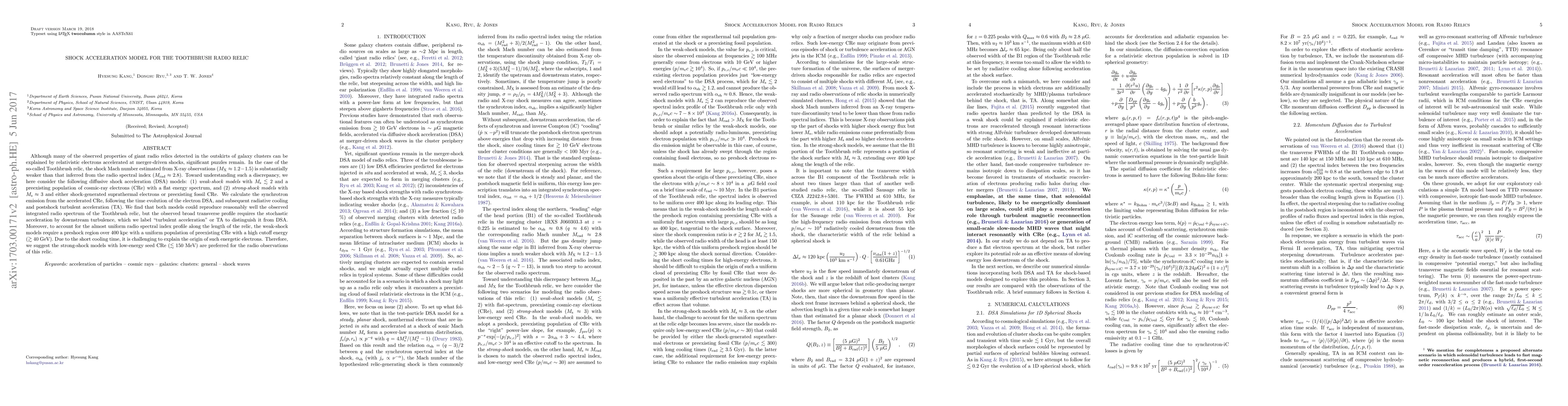 Researchers developed a shock acceleration model to explain the properties of the Toothbrush radio relic, finding that strong-shock models with low-energy seed electrons best reproduce its observed radio spectral index profile.