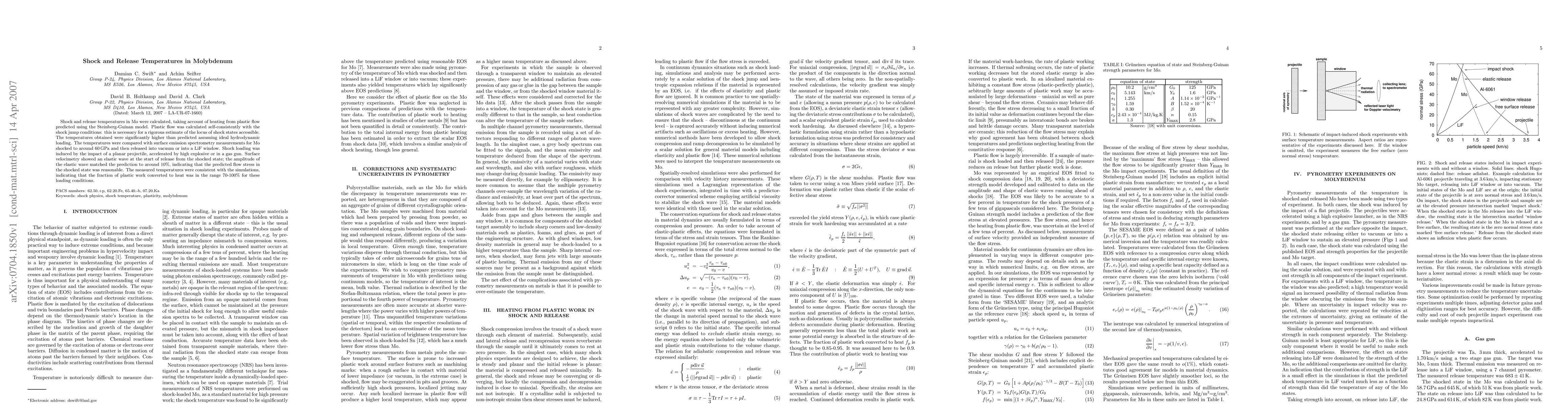 This study calculates shock and release temperatures in molybdenum, incorporating heating from plastic flow using the Steinberg-Guinan model. The results show significantly higher temperatures than ideal hydrodynamic loading predictions, consistent with experimental measurements and indicating 70-100% conversion of plastic work into heat.