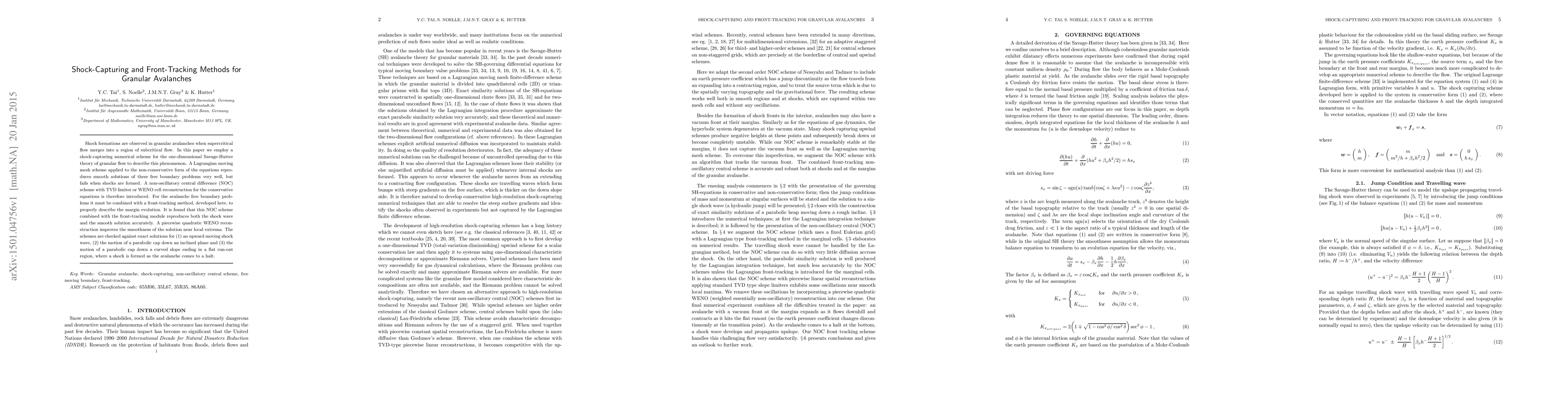 This paper develops a shock-capturing numerical scheme for modeling granular avalanches, combining a non-oscillatory central difference (NOC) scheme with a front-tracking method to accurately describe shock formations and smooth flow transitions. The method is validated against various exact solutions, demonstrating its effectiveness in capturing shock waves and smooth solutions.