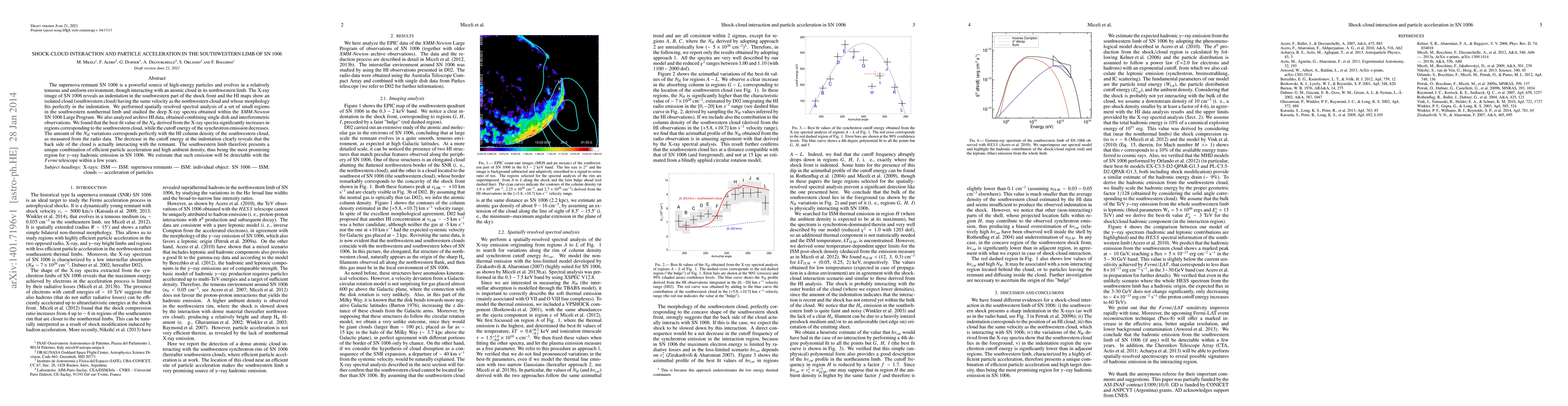 The paper investigates the interaction between the shock wave of SN 1006 and an atomic cloud, revealing significant particle acceleration in the southwestern limb. The study shows that the cloud's interaction with the shock front leads to detectable gamma-ray hadronic emission, which could be observed by the Fermi telescope in the near future.