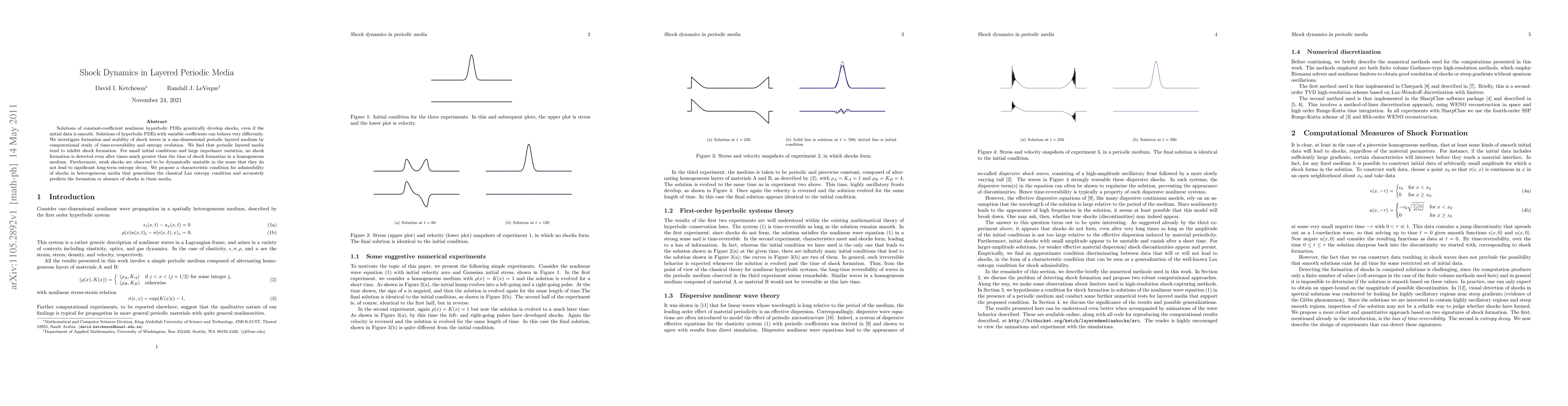 Solutions of constant-coefficient nonlinear hyperbolic PDEs generically develop shocks, even if the initial data is smooth. Solutions of hyperbolic PDEs with variable coefficients can behave very differently. We investigate formation and stability of shock waves in a one-dimensional periodic layered medium by computational study of time-reversibility and entropy evolution. We find that periodic layered media tend to inhibit shock formation. For small initial conditions and large impedance variation, no shock formation is detected even after times much greater than the time of shock formation in a homogeneous medium. Furthermore, weak shocks are observed to be dynamically unstable in the sense that they do not lead to significant long-term entropy decay. We propose a characteristic condition for admissibility of shocks in heterogeneous media that generalizes the classical Lax entropy condition and accurately predicts the formation or absence of shocks in these media.