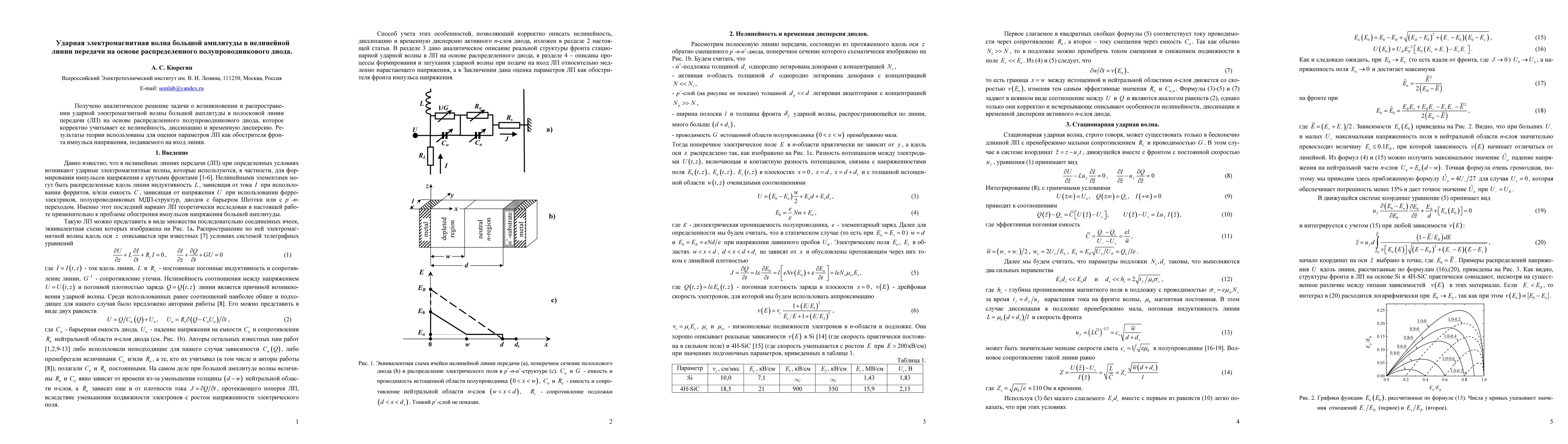 This paper presents an analytical solution for the formation and propagation of large amplitude shock electromagnetic waves in a strip transmission line based on distributed semiconductor diodes, considering non-linearity, time dispersion, and dissipation. The theoretical results are applied to estimate the parameters of the transmission line as a peaker for high voltage pulses.