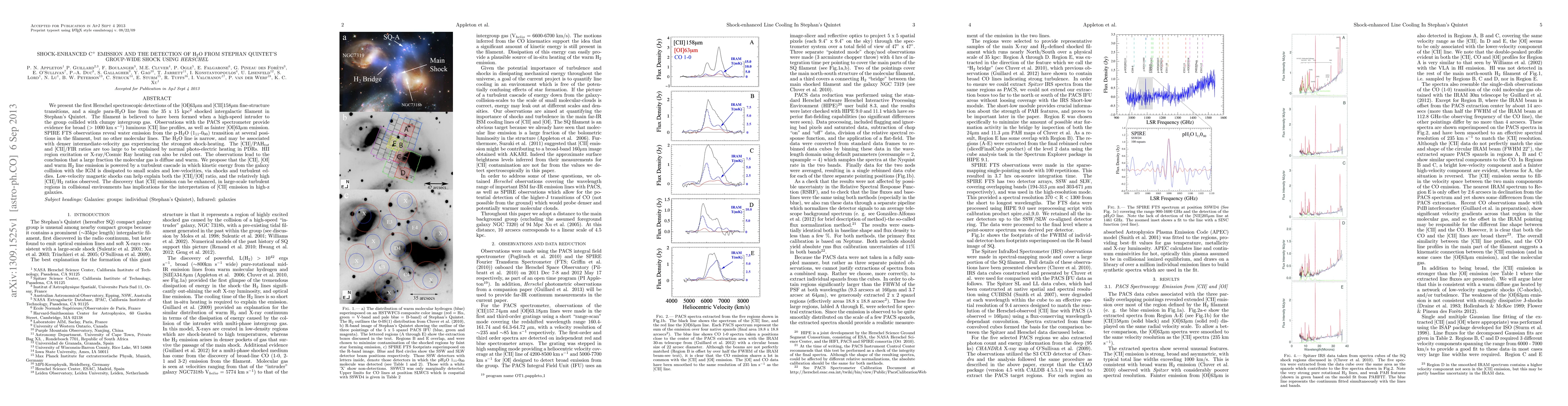 This paper reports the first detection of [OI]63, [CII]158 micron lines, and a para-H2O line from Stephan's Quintet's shocked intergalactic filament using Herschel. The observations suggest that kinetic energy from the galaxy collision with the IGM is dissipated via shocks and turbulent eddies, enhancing [CII] emission in turbulent regions.