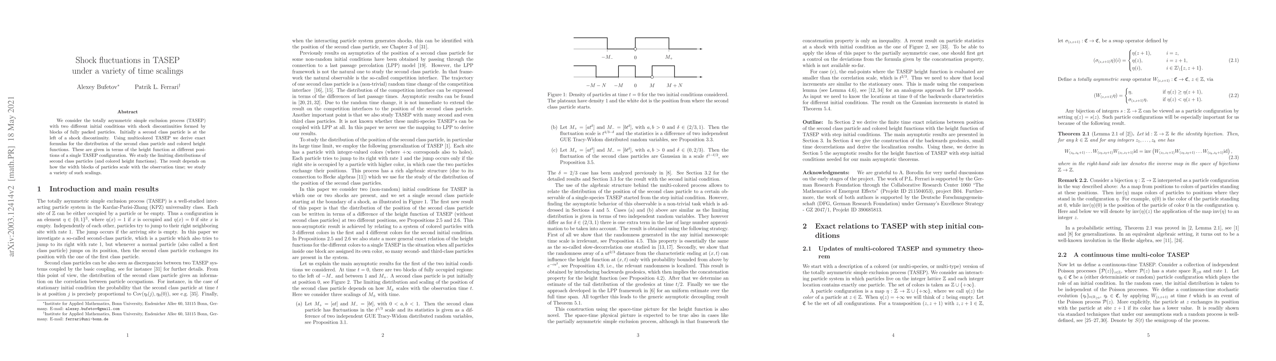 We consider the totally asymmetric simple exclusion process (TASEP) with two different initial conditions with shock discontinuities formed by blocks of fully packed particles. Initially a second class particle is at the left of a shock discontinuity. Using multicolored TASEP we derive exact formulas for the distribution of the second class particle and colored height functions. These are given in terms of the height function at different positions of a single TASEP configuration. We study the limiting distributions of second class particles (and colored height functions). The result depends on how the width blocks of particles scale with the observation time; we study a variety of such scalings.