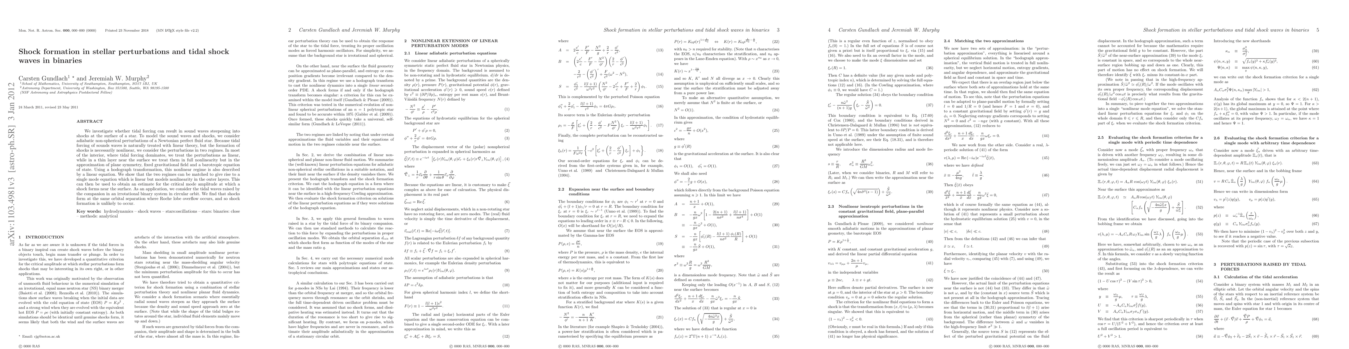 This paper explores the formation of shocks at a star's surface due to tidal perturbations, modeling sound waves and shocks through linear and nonlinear regimes. It concludes that shocks form near the Roche lobe overflow boundary, making shock formation unlikely in binary systems.