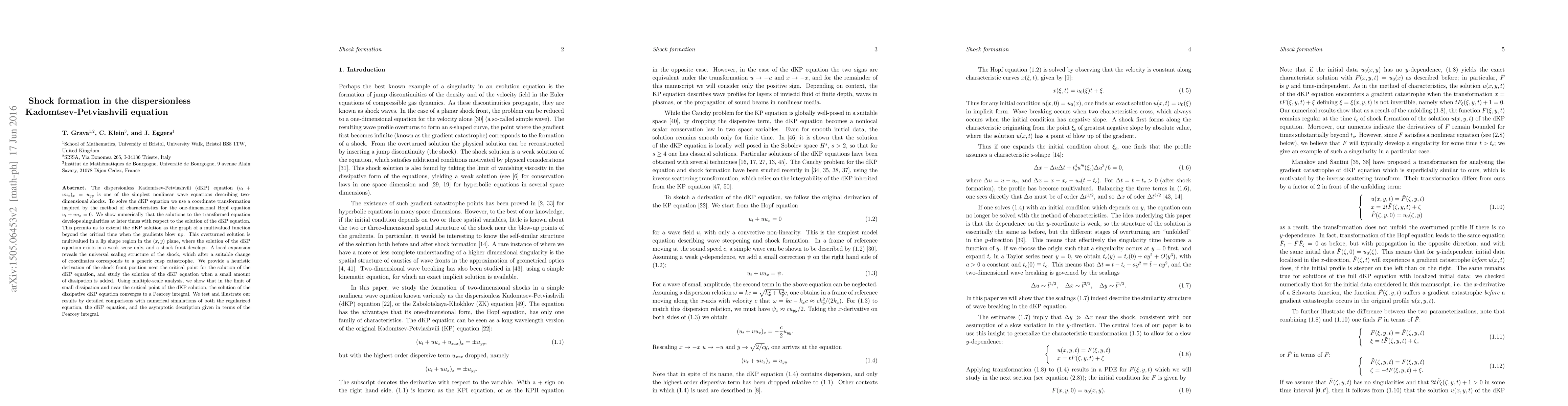 This paper investigates shock formation in the dispersionless Kadomtsev-Petviashvili (dKP) equation, demonstrating that a coordinate transformation prevents shock development in the transformed equation. It reveals the universal scaling structure of shocks as a generic cusp catastrophe and provides a heuristic derivation for the shock front position near the critical point, showing convergence to a Pearcey integral under small dissipation.