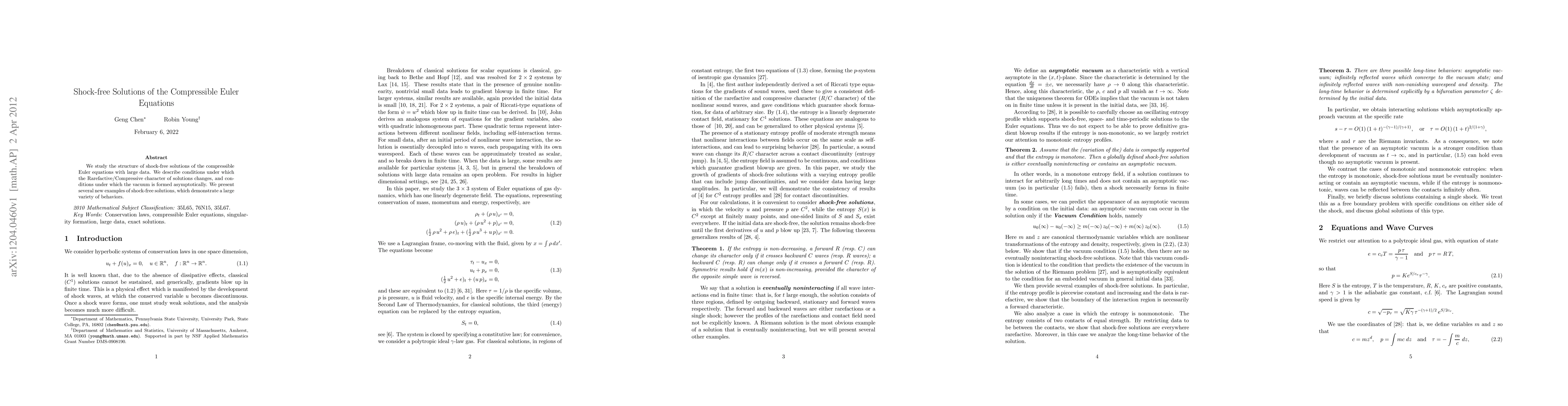 The paper studies shock-free solutions of the compressible Euler equations with large data, analyzing conditions for changes in rarefactive/compressive solution characteristics and vacuum formation asymptotically.