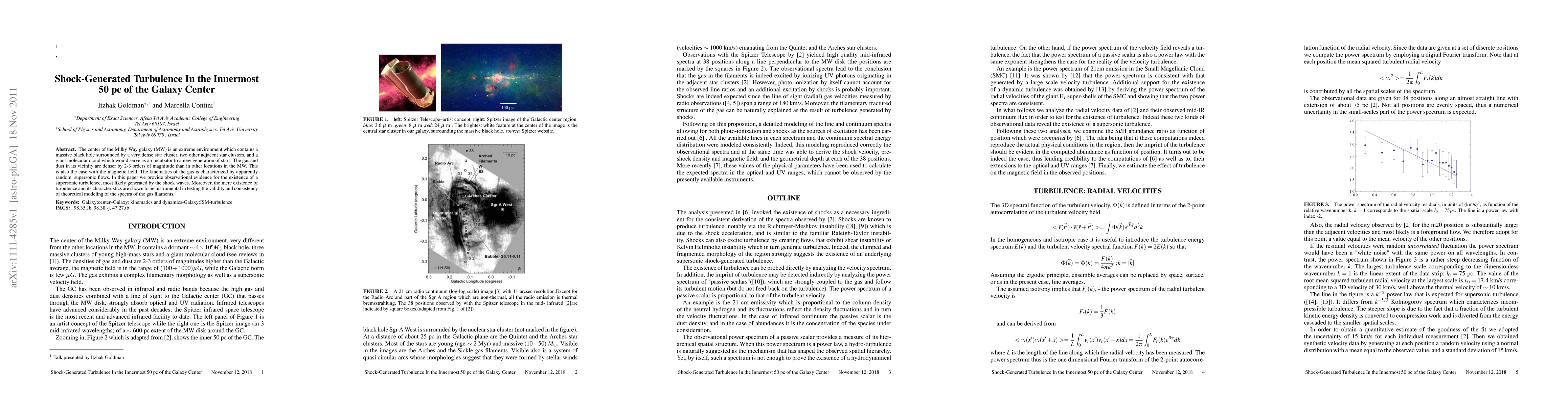 The center of the Milky Way galaxy (MW) is an extreme environment which contains a massive black hole surrounded by a very dense star cluster, two other adjacent star clusters, and a giant molecular cloud which would serve as an incubator to a new generation of stars. The gas and dust in its vicinity are denser by 2-3 orders of magnitude than in other locations in the MW. This is also the case with the magnetic field. The kinematics of the gas is characterized by apparently random, supersonic flows. In this paper we provide observational evidence for the existence of a supersonic turbulence, most likely generated by the shock waves. Moreover, the mere existence of turbulence and its characteristics are shown to be instrumental in testing the validity and consistency of theoretical modeling of the spectra of the gas filaments.