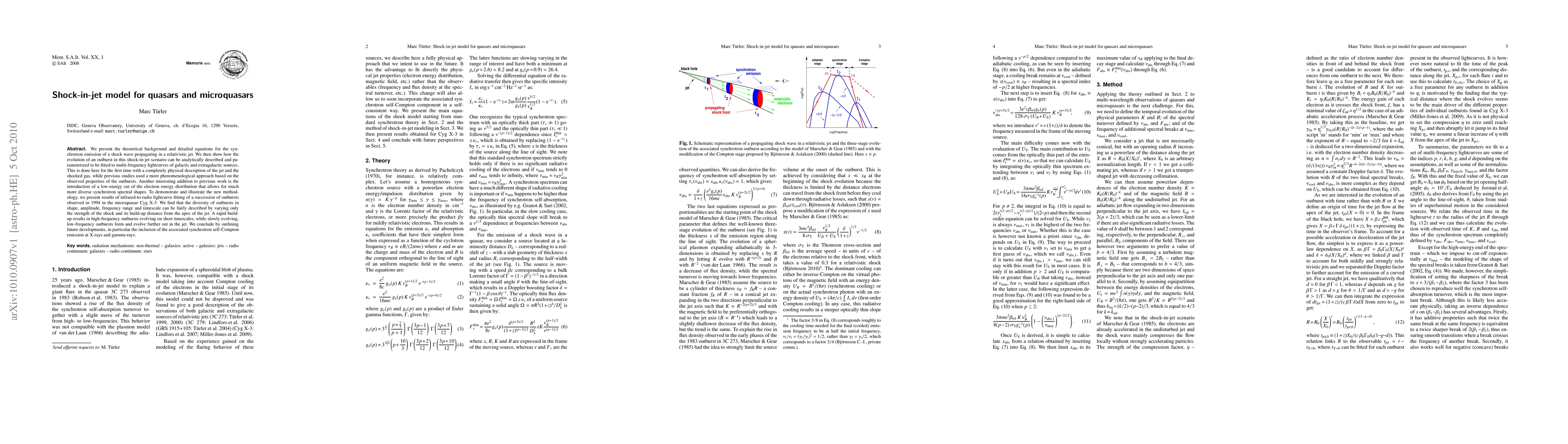 We present the theoretical background and detailed equations for the synchrotron emission of a shock wave propagating in a relativistic jet. We then show how the evolution of an outburst in this shock-in-jet scenario can be analytically described and parameterized to be fitted to multi-frequency lightcurves of galactic and extragalactic sources. This is done here for the first time with a completely physical description of the jet and the shocked gas, while previous studies used a more phenomenological approach based on the observed properties of the outbursts. Another interesting addition to previous work is the introduction of a low-energy cut of the electron energy distribution that allows for much more diverse synchrotron spectral shapes. To demonstrate and illustrate the new methodology, we present results of infrared-to-radio lightcurve fitting of a succession of outbursts observed in 1994 in the microquasar Cyg X-3. We find that the diversity of outbursts in shape, amplitude, frequency range and timescale can be fairly described by varying only the strength of the shock and its build-up distance from the apex of the jet. A rapid build-up results in high-frequency outbursts evolving on short timescales, while slowly evolving, low-frequency outbursts form and evolve further out in the jet. We conclude by outlining future developments, in particular the inclusion of the associated synchrotron self-Compton emission at X-rays and gamma-rays.