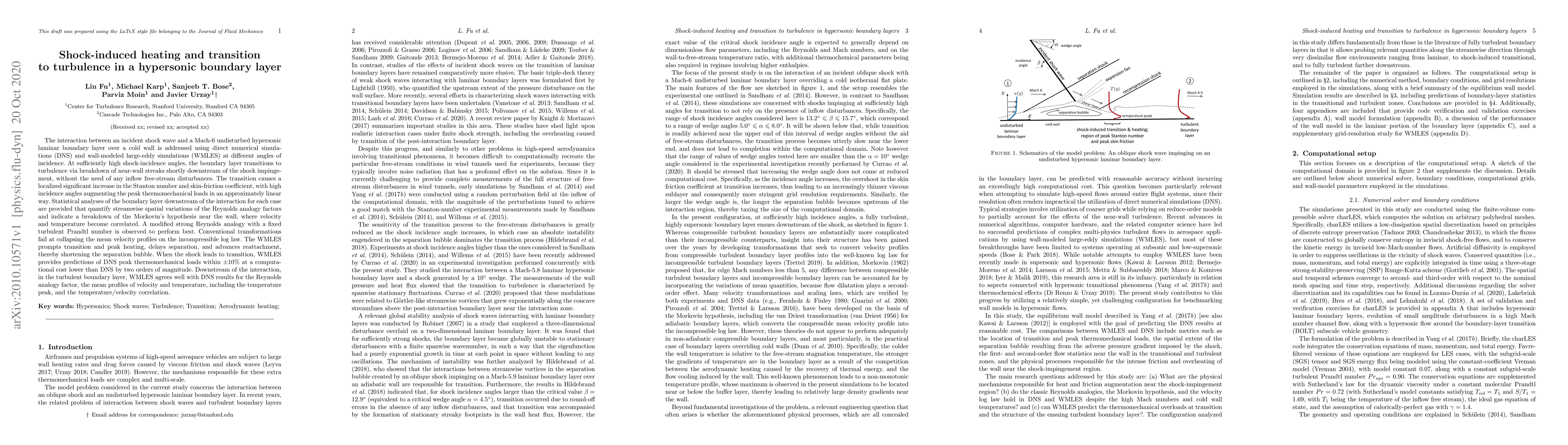 This study investigates the shock-induced transition to turbulence in a hypersonic boundary layer using DNS and WMLES. At high shock-incidence angles, the boundary layer transitions to turbulence, significantly increasing Stanton number and skin-friction, with peak thermomechanical loads augmenting linearly. WMLES effectively predicts DNS results for peak loads and turbulent boundary layer characteristics at a much lower computational cost.