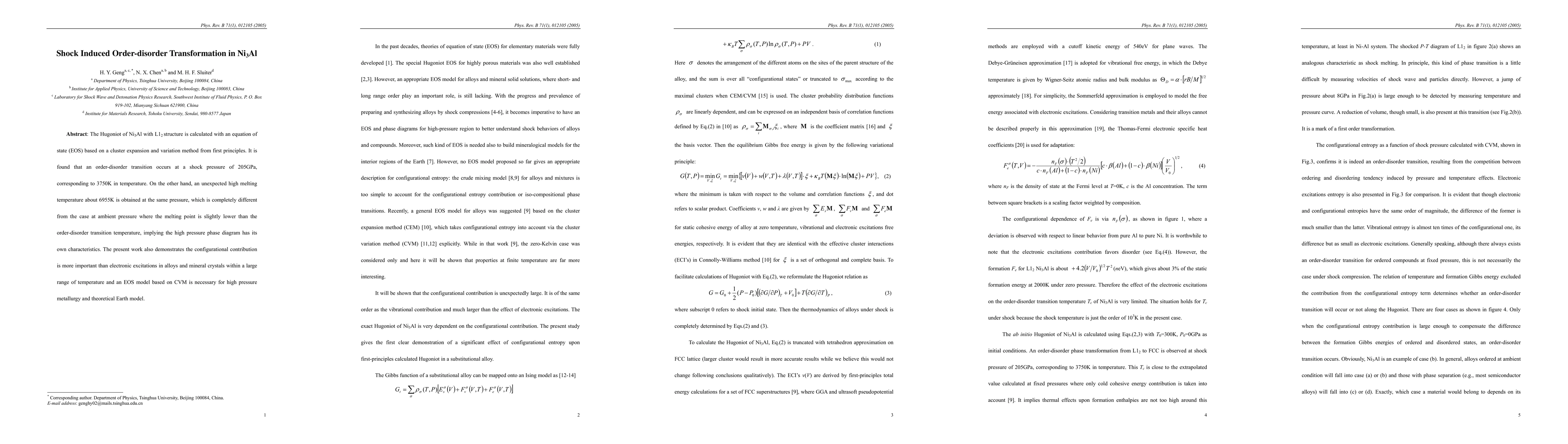 The Hugoniot of Ni3Al with L12 structure is calculated with an equation of state (EOS) based on a cluster expansion and variation method from first principles. It is found that an order-disorder transition occurs at a shock pressure of 205GPa, corresponding to 3750K in temperature. On the other hand, an unexpected high melting temperature about 6955K is obtained at the same pressure, which is completely different from the case at ambient pressure where the melting point is slightly lower than the order-disorder transition temperature, implying the high pressure phase diagram has its own characteristics. The present work also demonstrates the configurational contribution is more important than electronic excitations in alloys and mineral crystals within a large range of temperature, and an EOS model based on CVM is necessary for high pressure metallurgy and theoretical Earth model.