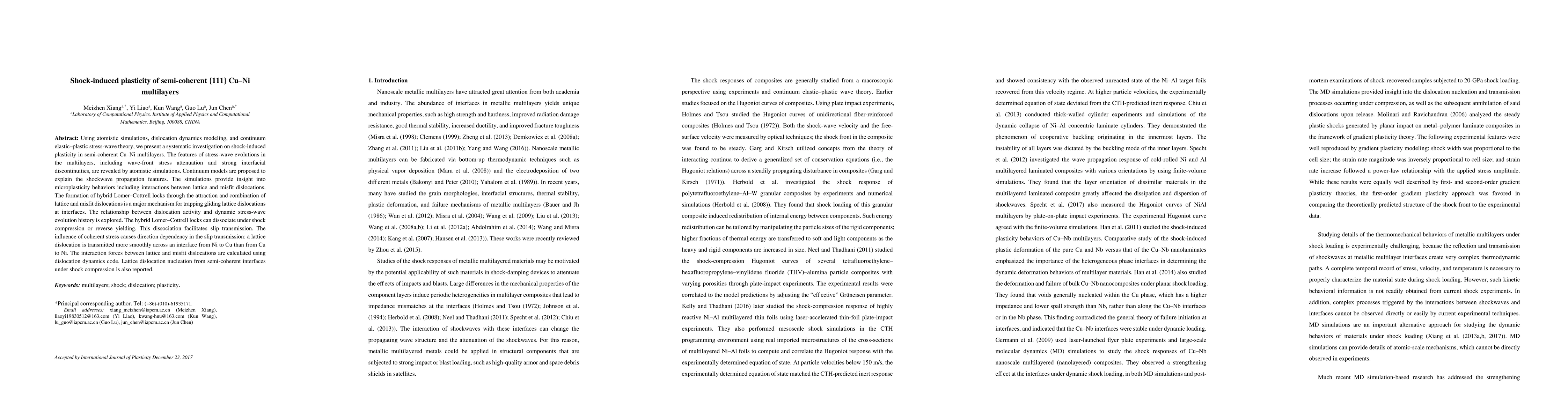 This research uses atomistic simulations and continuum models to study shock-induced plasticity in Cu-Ni multilayers, revealing stress wave features and microplasticity behaviors. It highlights the role of hybrid Lomer-Cottrell locks in dislocation trapping and slip transmission, with direction-dependent slip transmission influenced by coherent stress.