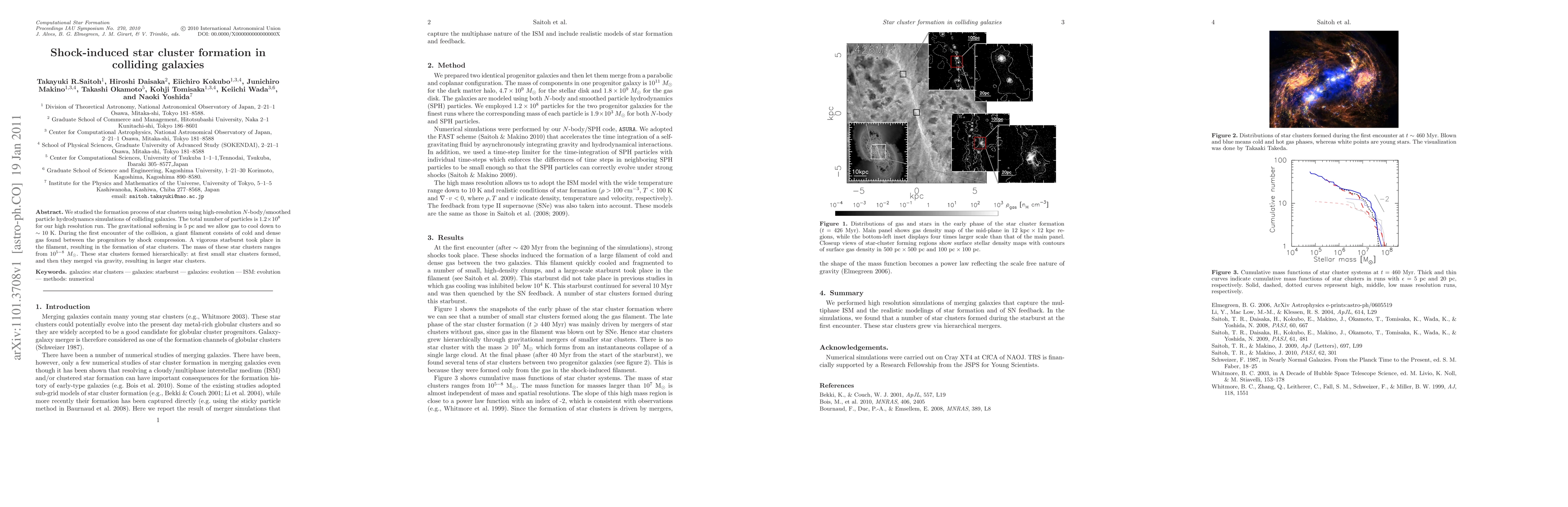 We studied the formation process of star clusters using high-resolution N-body/smoothed particle hydrodynamcs simulations of colliding galaxies. The total number of particles is 1.2x10^8 for our high resolution run. The gravitational softening is 5 pc and we allow gas to cool down to \sim 10 K. During the first encounter of the collision, a giant filament consists of cold and dense gas found between the progenitors by shock compression. A vigorous starburst took place in the filament, resulting in the formation of star clusters. The mass of these star clusters ranges from 10^{5-8} Msun. These star clusters formed hierarchically: at first small star clusters formed, and then they merged via gravity, resulting in larger star clusters.