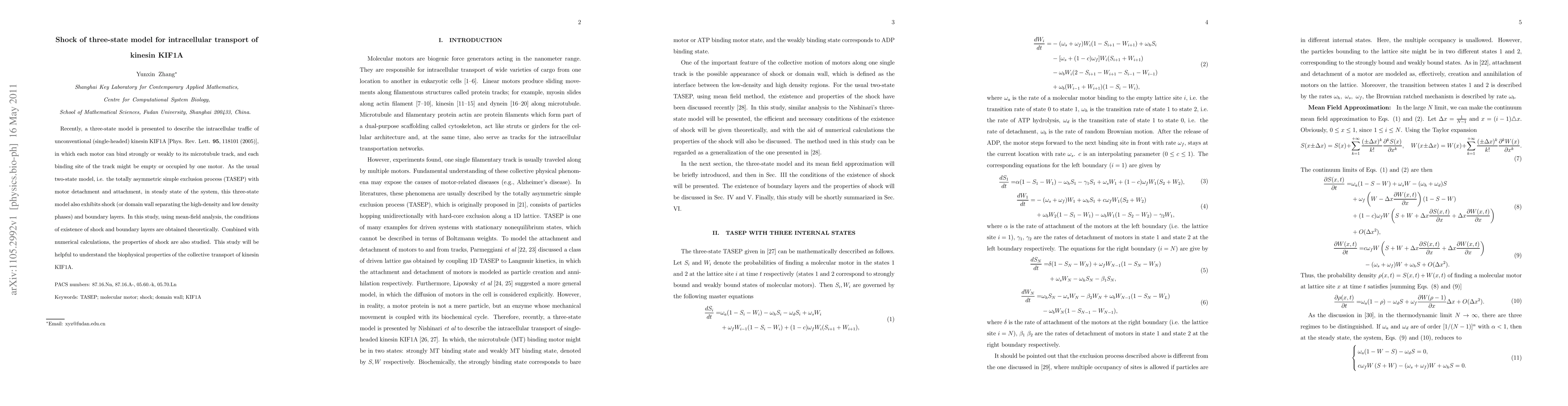 Researchers developed a three-state model to describe kinesin KIF1A's intracellular transport, finding conditions for shock and boundary layers that exist in steady state, with implications for understanding collective transport properties.
