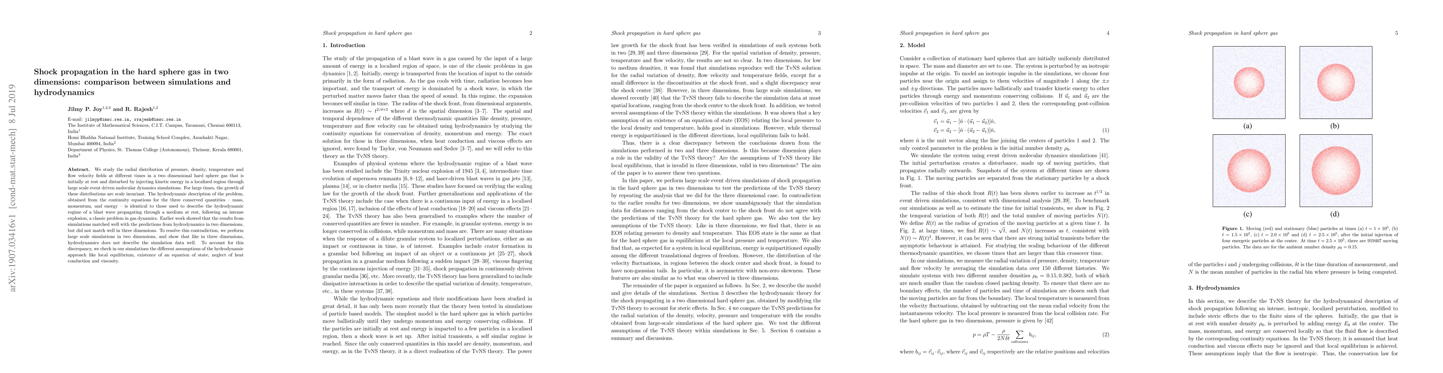 This paper investigates shock wave propagation in two-dimensional hard sphere gas using molecular dynamics simulations, comparing results with hydrodynamic theory. It finds that while hydrodynamics matches simulations in two dimensions for large times, it fails to describe the data accurately, highlighting discrepancies in assumptions like local equilibrium and neglect of heat conduction and viscosity.