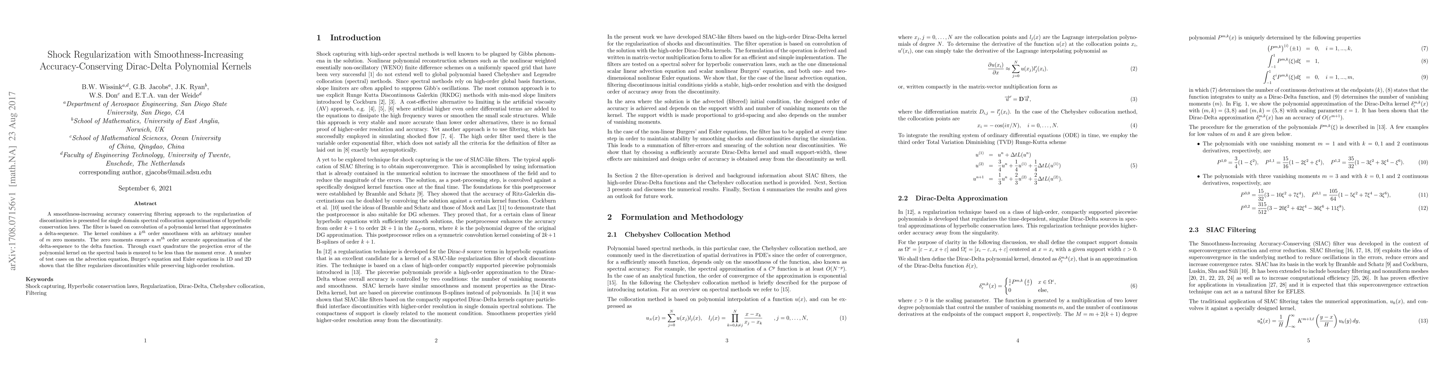 A new filtering approach is introduced to regularize discontinuities in hyperbolic conservation laws while preserving high-order resolution, using a smoothness-increasing accuracy-conserving Dirac-Delta polynomial kernel.