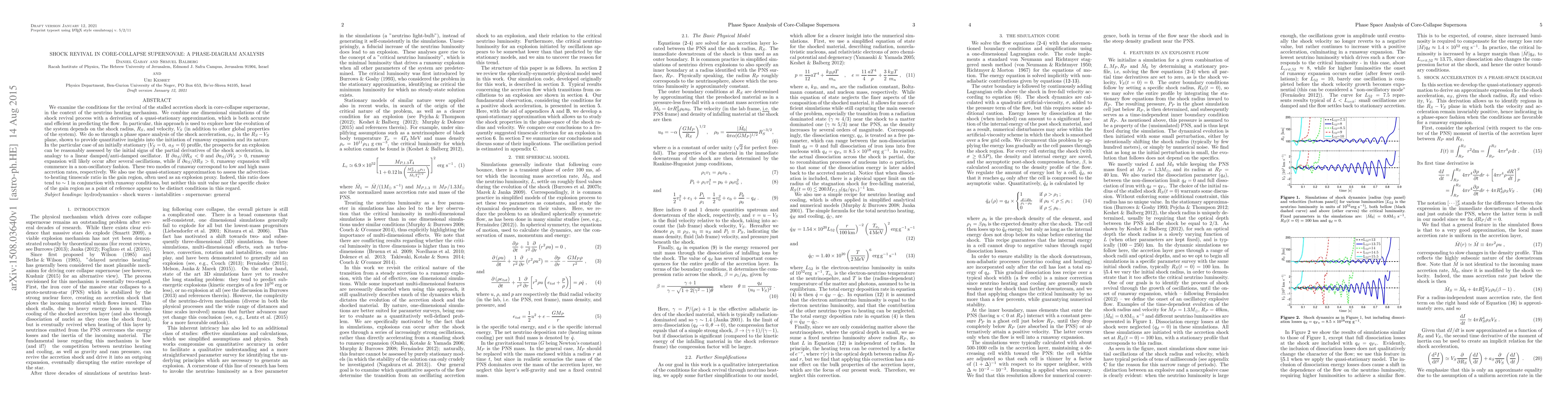 We examine the conditions for the revival of the stalled accretion shock in core-collapse supernovae, in the context of the neutrino heating mechanism. We combine one dimensional simulations of the shock revival process with a derivation of a quasi-stationary approximation, which is both accurate and efficient in predicting the flow. In particular, this approach is used to explore how the evolution of the system depends on the shock radius, $R_S$, and velocity, $V_S$ (in addition to other global properties of the system). We do so through a phase space analysis of the shock acceleration, $a_S$, in the $R_S-V_S$ plane, shown to provide quantitative insights into the initiation of runaway expansion and its nature. In the particular case of an initially stationary ($V_S=0,\;a_S=0$) profile, the prospects for an explosion can be reasonably assessed by the initial signs of the partial derivatives of the shock acceleration, in analogy to a linear damped/anti-damped oscillator. If $\partial a_S/\partial R_S<0$ and $\partial a_S/\partial V_S>0$, runaway expansion will likely occur after several oscillations, while if $\partial a_S/\partial R_S>0$, runaway expansion will commence in a non-oscillatory fashion. These two modes of runaway correspond to low and high mass accretion rates, respectively. We also use the quasi-stationary approximation to assess the advection-to-heating timescale ratio in the gain region, often used as an explosion proxy. Indeed, this ratio does tend to $\sim1$ in conjunction with runaway conditions, but neither this unit value nor the specific choice of the gain region as a point of reference appear to be distinct conditions in this regard.