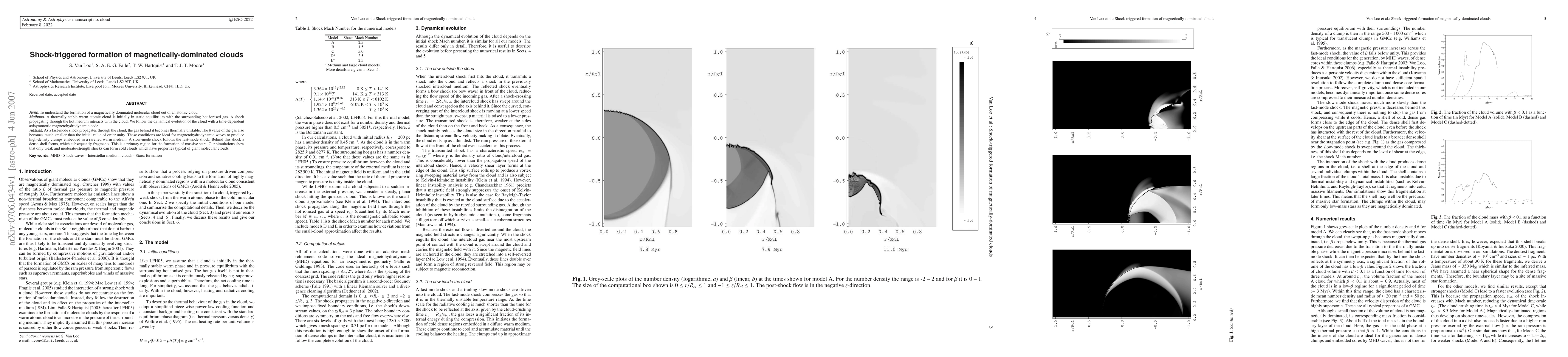 This paper investigates the formation of magnetically-dominated molecular clouds from atomic clouds via shock interactions, showing that only weak to moderate shocks can create cold, dense clouds resembling giant molecular clouds. The study uses a time-dependent magnetohydrodynamic code to simulate the dynamical evolution and fragmentation of the cloud.