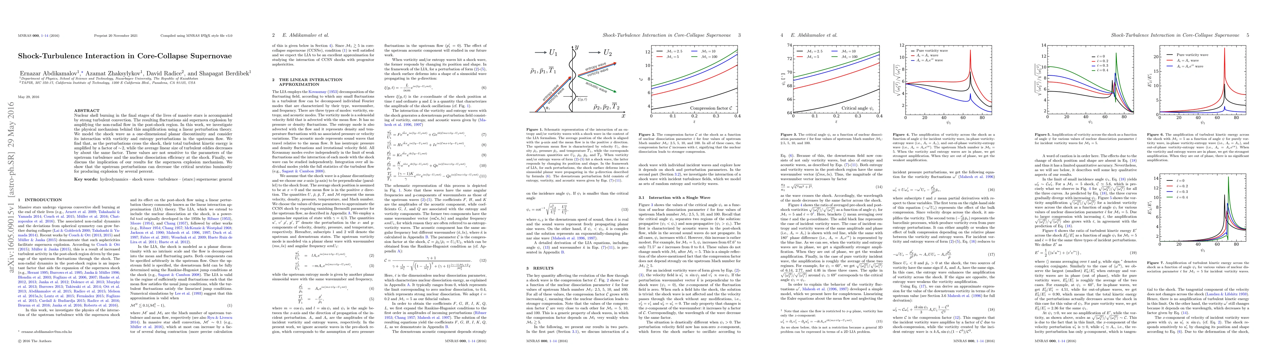 This paper investigates the amplification of turbulent kinetic energy in core-collapse supernovae through shock-turbulence interaction using linear perturbation theory. The study finds that perturbations crossing the shock increase in energy by a factor of two while reducing the size of turbulent eddies, which may lower the critical neutrino luminosity needed for a successful supernova explosion.