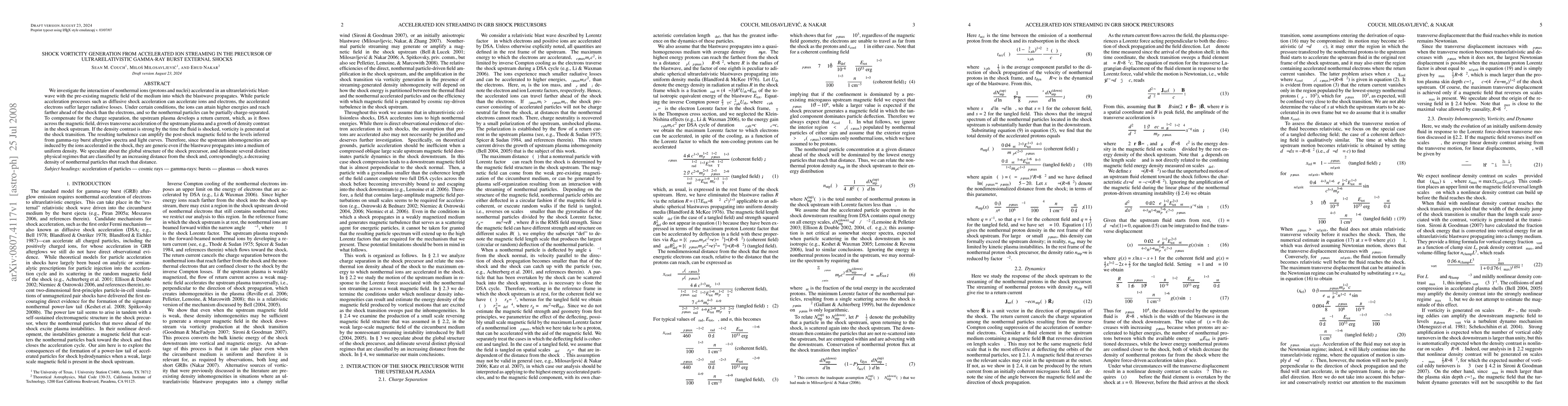This paper explores how accelerated ions in ultrarelativistic gamma-ray burst external shocks generate shock vorticity through charge separation and return currents, leading to turbulence that amplifies post-shock magnetic fields, supporting observed gamma-ray burst afterglow spectra and light curves. The study identifies distinct physical regimes in the shock precursor based on the distance from the shock and the density of nonthermal particles.