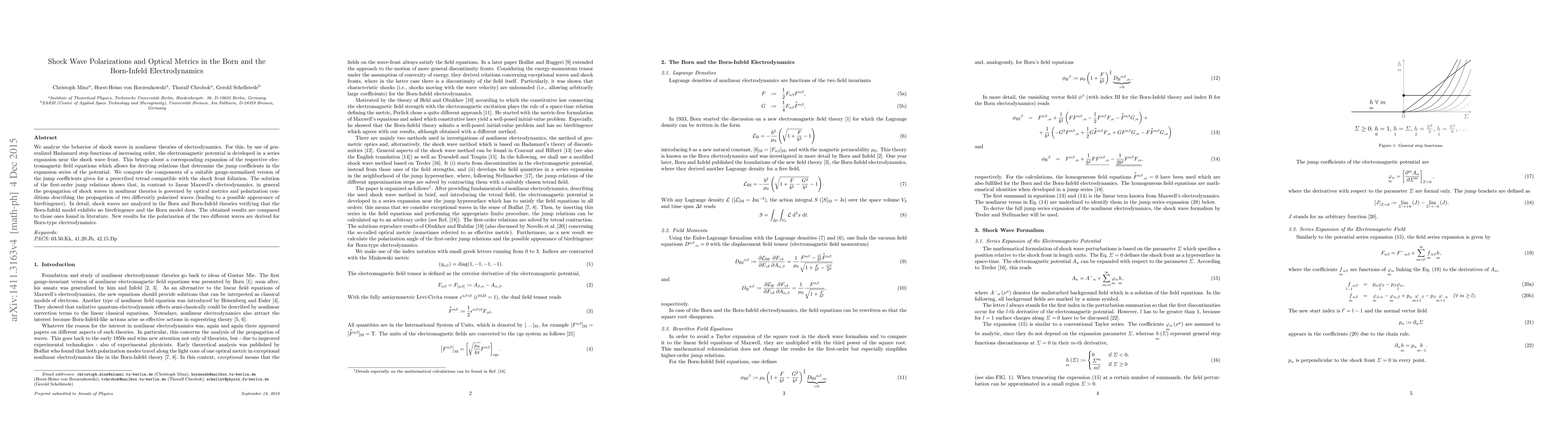 This paper explores the behavior of shock waves in nonlinear electrodynamics, specifically in Born and Born-Infeld theories, revealing that shock wave propagation is governed by optical metrics and polarization conditions. Unlike linear Maxwell's theory, nonlinear theories show birefringence, with the Born model exhibiting it while the Born-Infeld model does not.