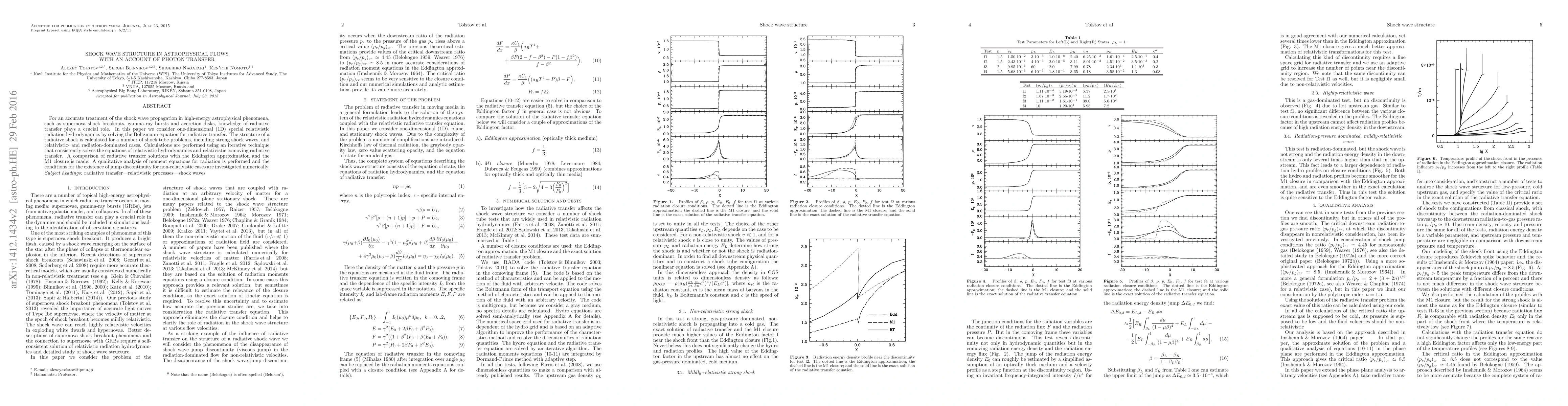 For an accurate treatment of the shock wave propagation in high-energy astrophysical phenomena, such as supernova shock breakouts, gamma-ray bursts and accretion disks, knowledge of radiative transfer plays a crucial role. In this paper we consider one-dimensional (1D) special relativistic radiation hydrodynamics by solving the Boltzmann equation for radiative transfer. The structure of a radiative shock is calculated for a number of shock tube problems, including strong shock waves, and relativistic- and radiation-dominated cases. Calculations are performed using an iterative technique that consistently solves the equations of relativistic hydrodynamics and relativistic comoving radiative transfer. A comparison of radiative transfer solutions with the Eddington approximation and the M1 closure is made. A qualitative analysis of moment equations for radiation is performed and the conditions for the existence of jump discontinuity for non-relativistic cases are investigated numerically.