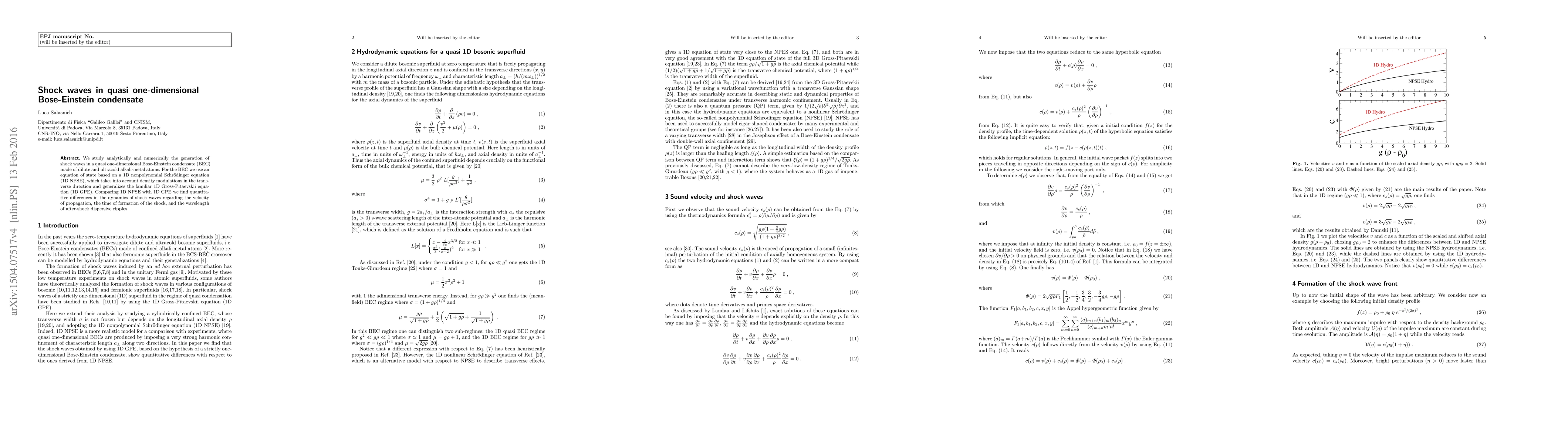 The paper presents a detailed comparison between 1D NPSE and 1D GPE in describing shock wave dynamics in quasi one-dimensional BECs, providing analytical and numerical solutions for velocities and density profiles.