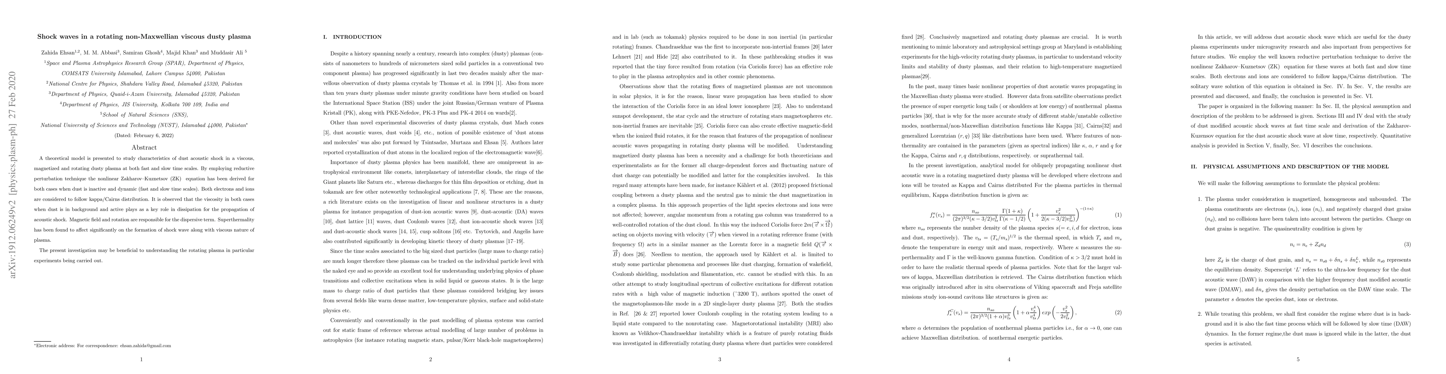 This paper presents a theoretical model to study dust acoustic shocks in a viscous, magnetized, and rotating dusty plasma, employing the reductive perturbation technique to derive the nonlinear Zakharov-Kuznetsov equation. It highlights the significant role of viscosity and superthermality in shock wave formation, with magnetic fields and rotation influencing the dispersive term.