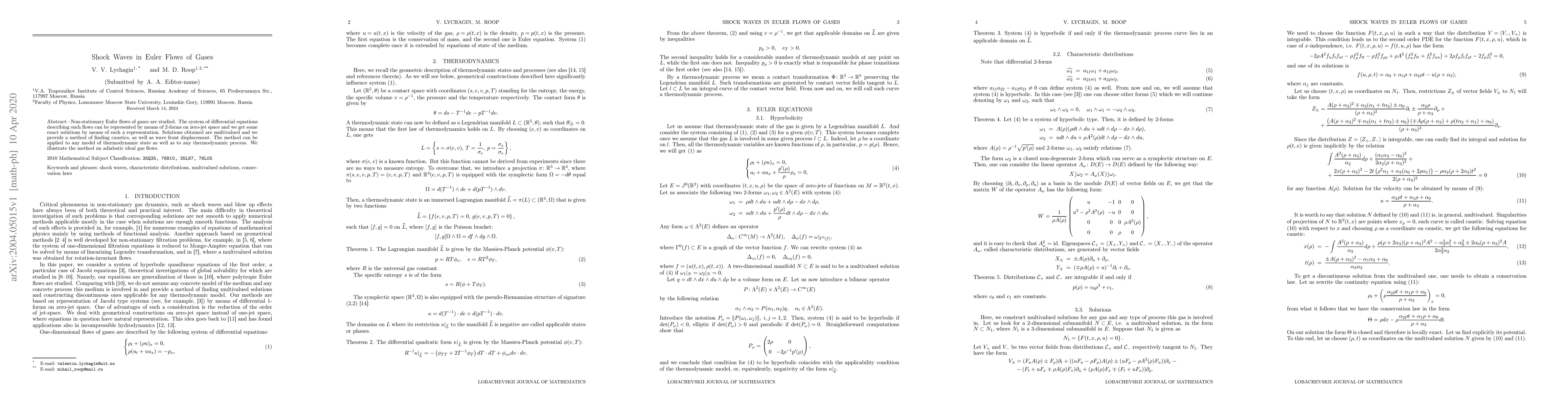 This paper studies non-stationary Euler flows of gases, deriving exact solutions using 2-forms on zero-jet space. It introduces a method for finding caustics and wave front displacement applicable to any thermodynamic model and process, demonstrated through adiabatic ideal gas flows.
