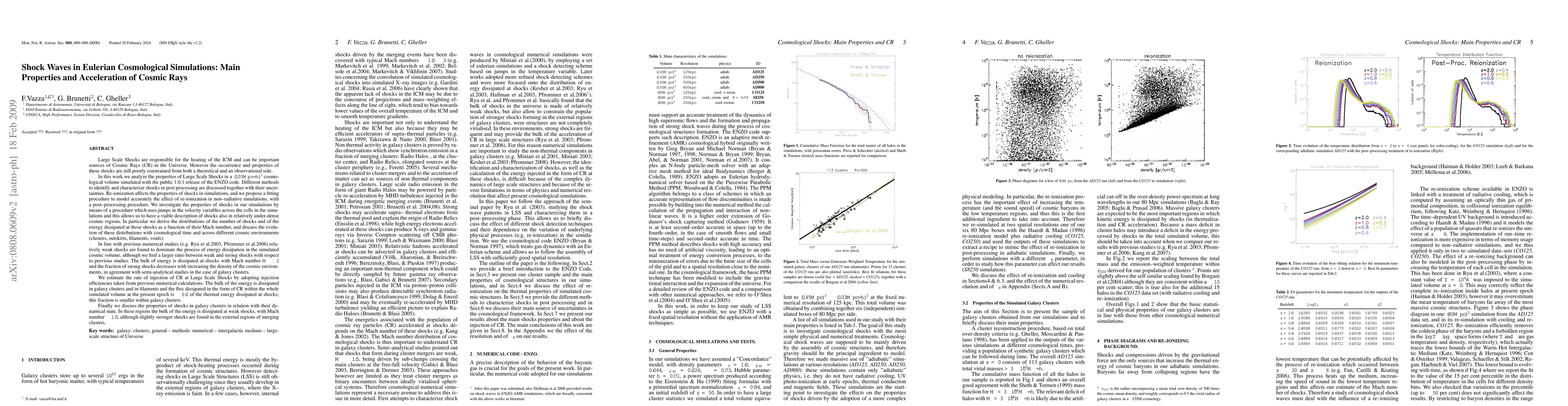 This paper examines large-scale shock waves in cosmological simulations using the ENZO code, focusing on their properties and the acceleration of cosmic rays. It proposes a fitting method to model re-ionization effects and finds that weak shocks dominate energy dissipation, with a significant fraction of energy converted into cosmic rays.