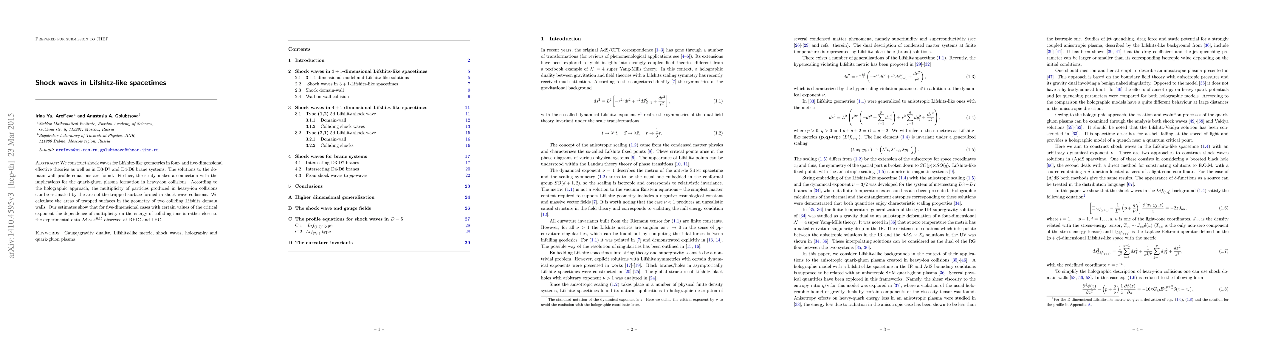 This paper creates shock waves in Lifshitz-like spacetimes and connects them to quark-gluon plasma formation in heavy-ion collisions, with estimates suggesting a dependency of particle multiplicity on collision energy similar to experimental data.